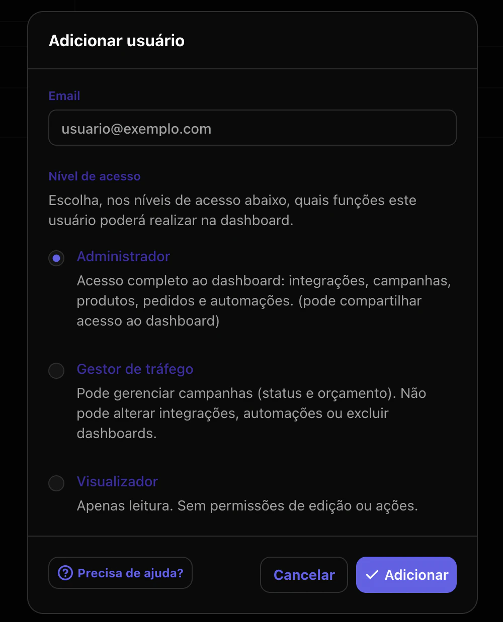 Can manage campaigns (status and budget). Cannot change integrations, automations, or delete dashboards.- ✅ View metrics and reports