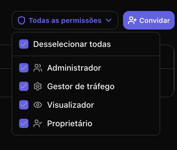 On the main screen, you can filter the user list by clicking on All permissions and selecting a specific level.