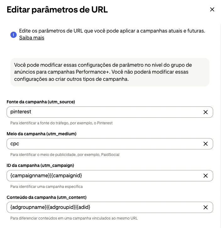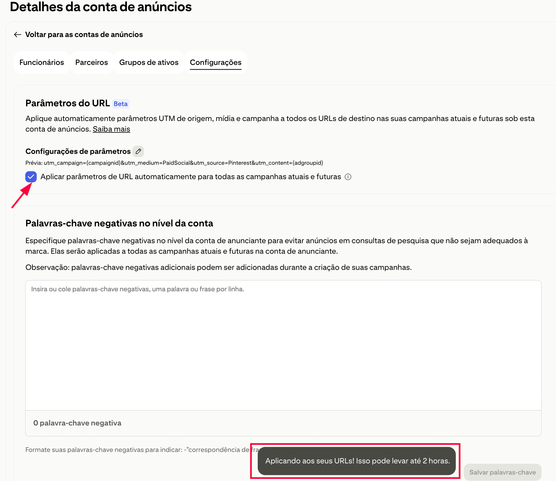 - Marque a opção Aplicar parâmetros de URL automaticamente para todas as campanhas atuais e futuras