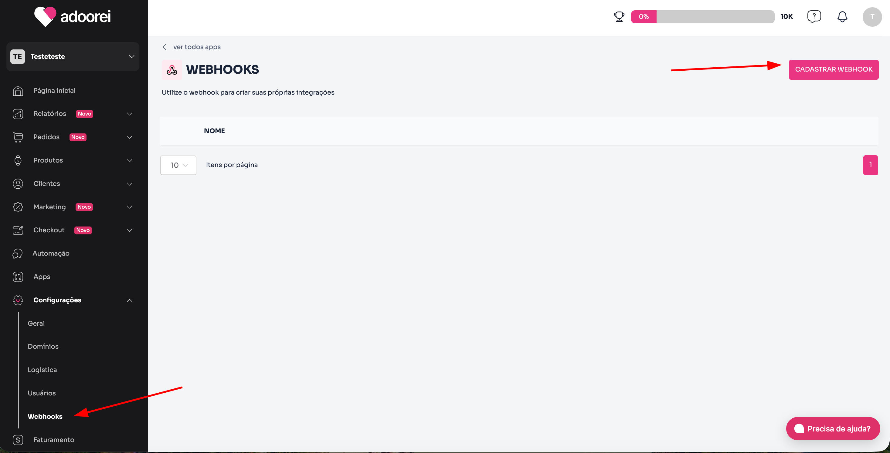 - Em seguida, clique em Webhooks e no botão Cadastrar webhook.