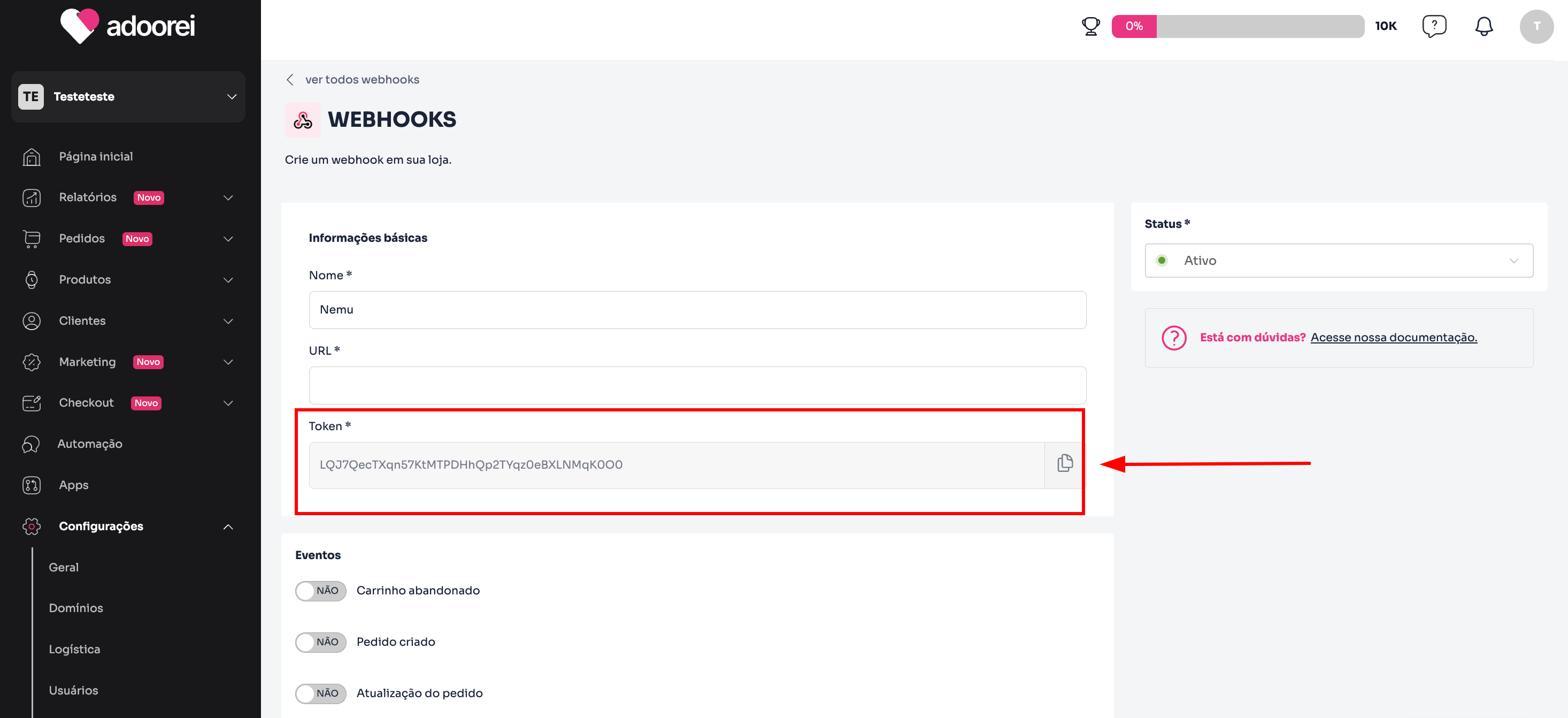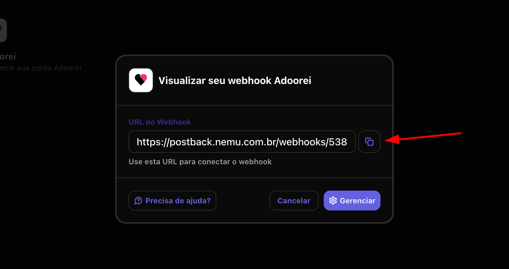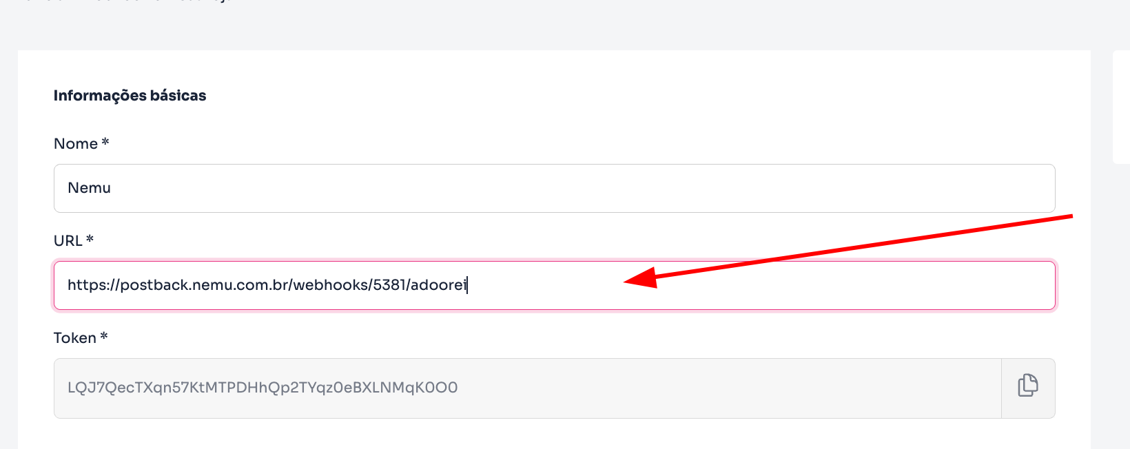 - Clique no botão para copiar a URL do webhook gerada pela Nemu.