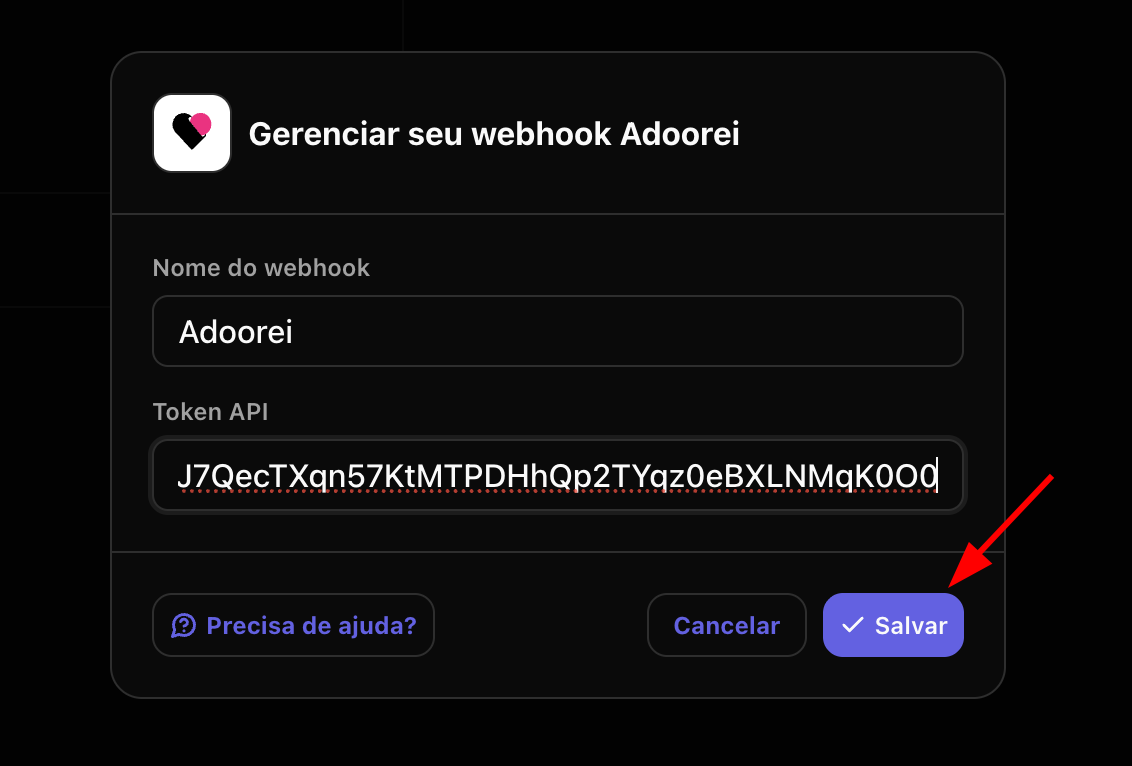 - Defina um nome para o webhook, cole o token copiado no passo anterior e clique em Salvar.