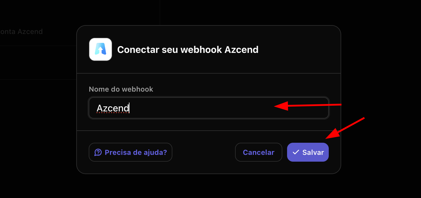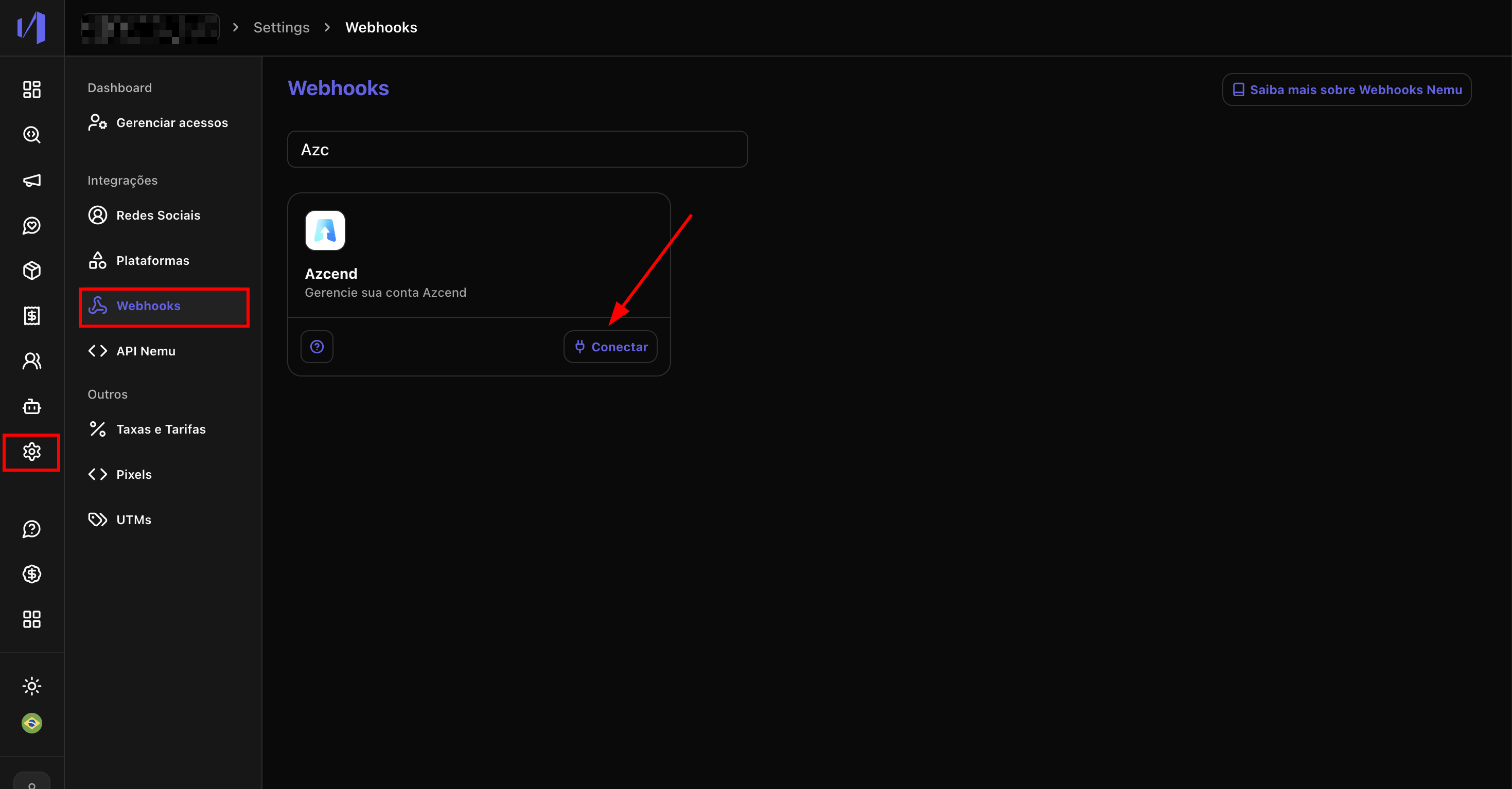 - Acesse Configurações > Webhooks, Pesquise por Azcend e clique em Conectar.
