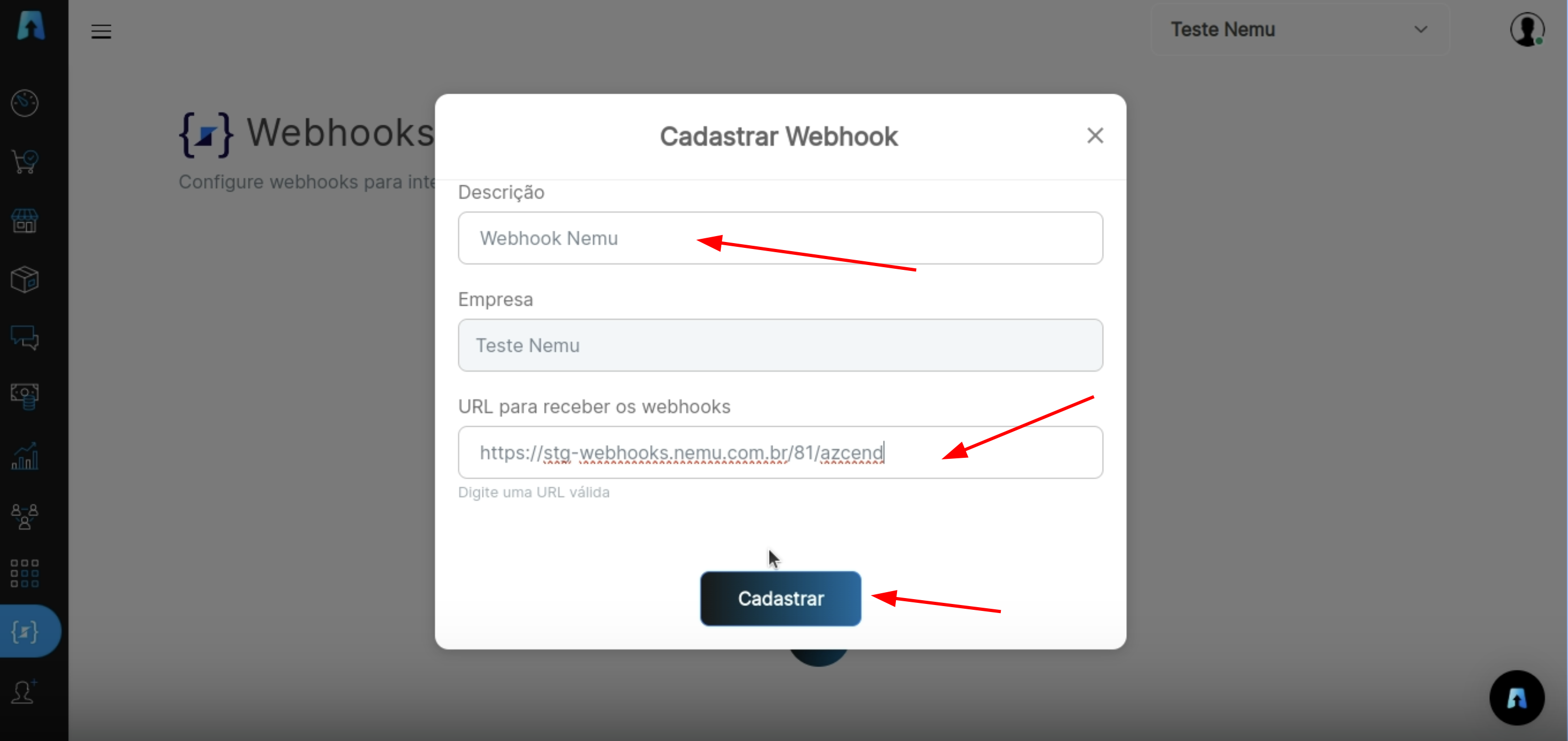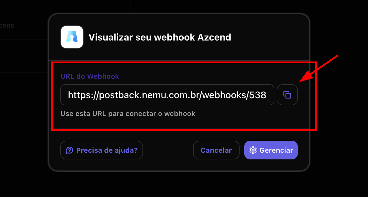 - Clique no botão para copiar a URL do webhook gerada pela Nemu.