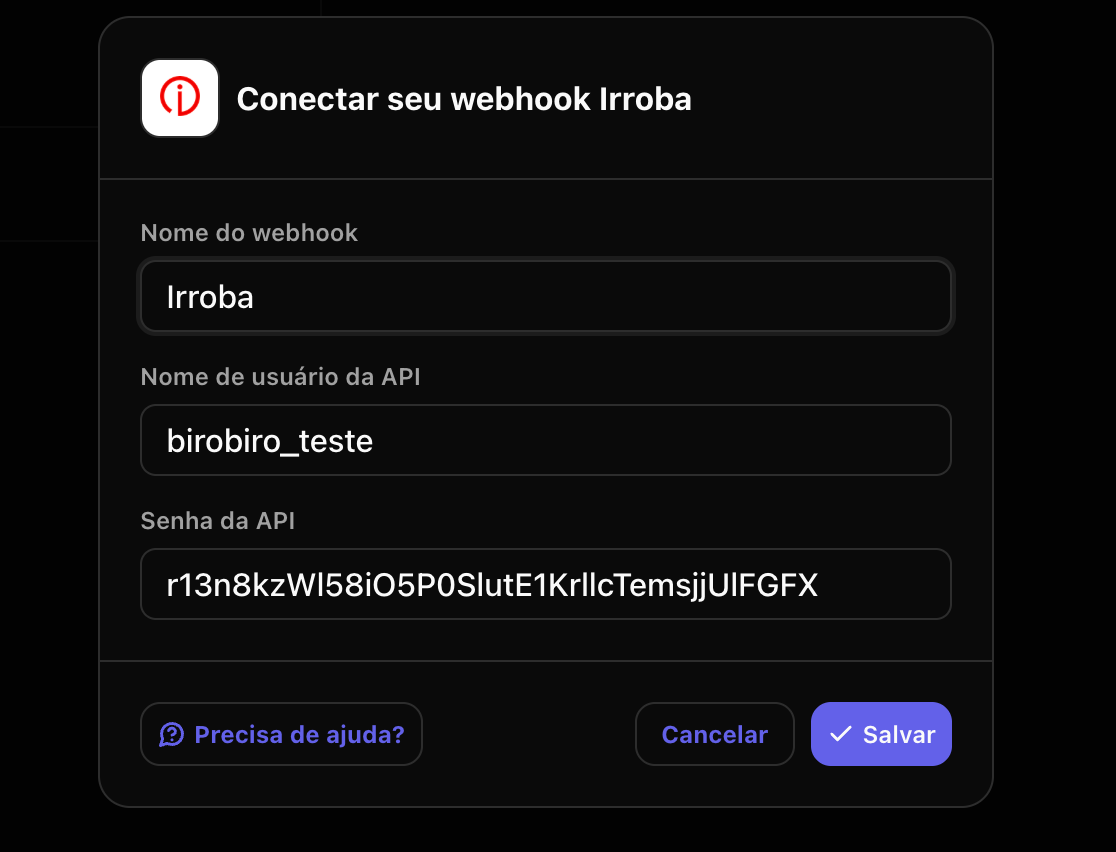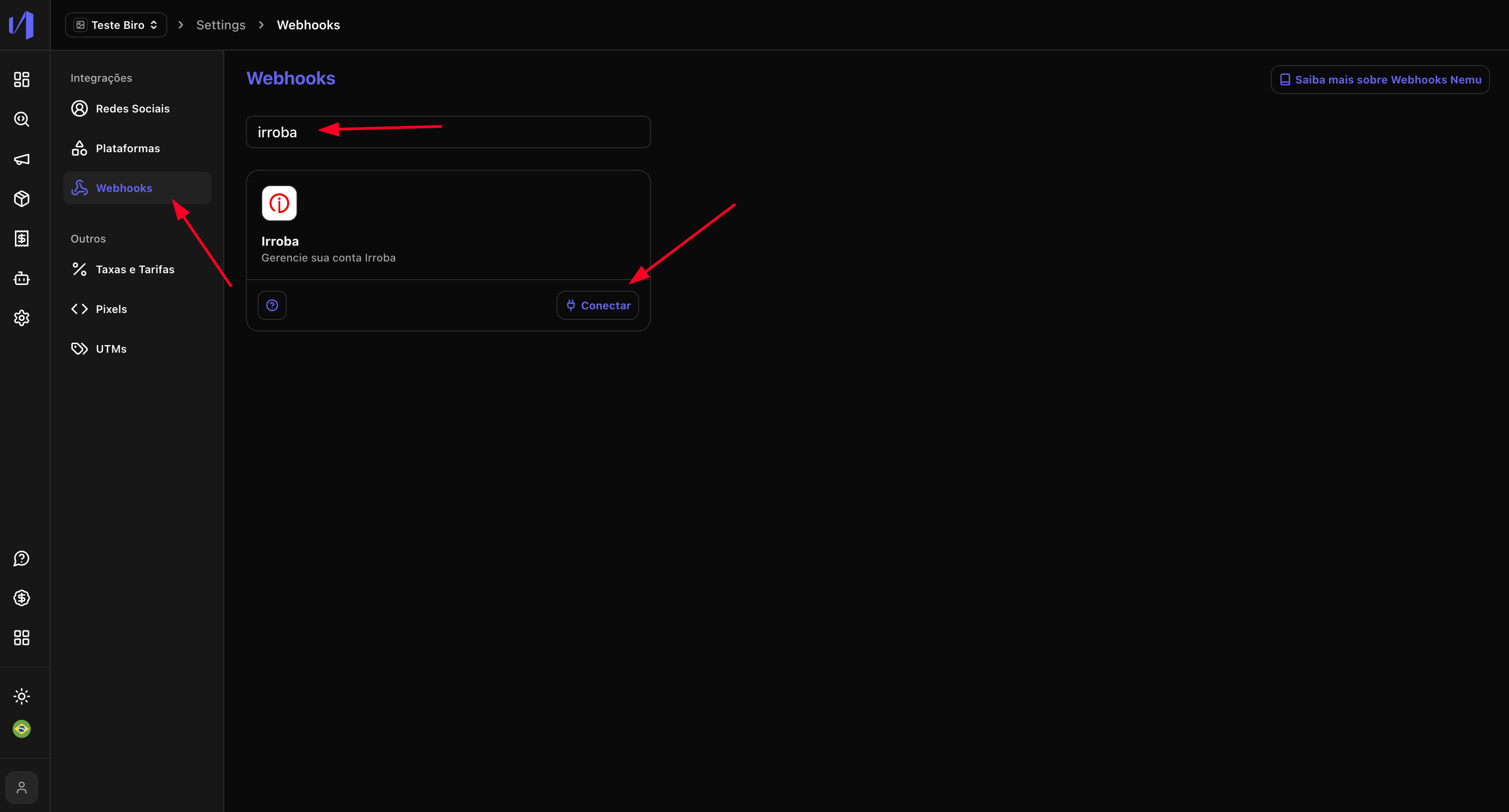 Na Nemu em Configurações acesse Webhooks e pesquise por Irroba e clique em Conectar