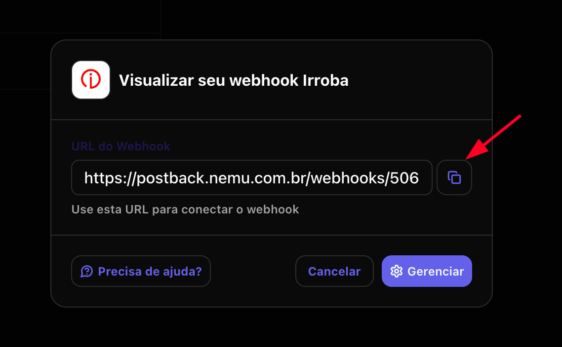 Copie a URL do Webhook gerada e retorne para a Irroba
