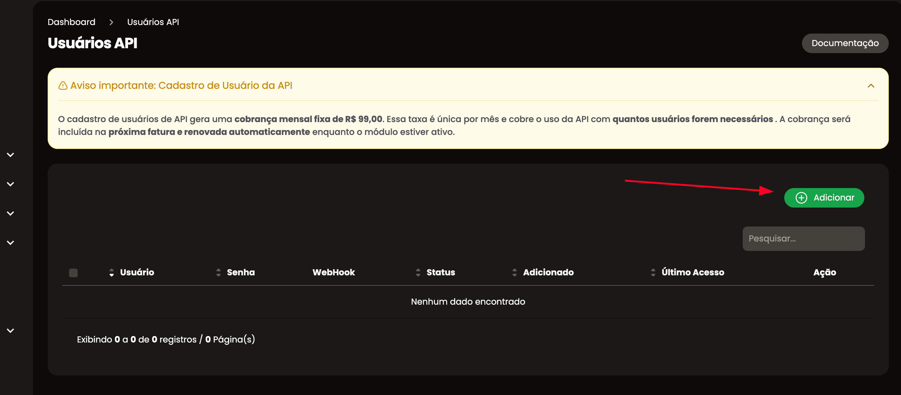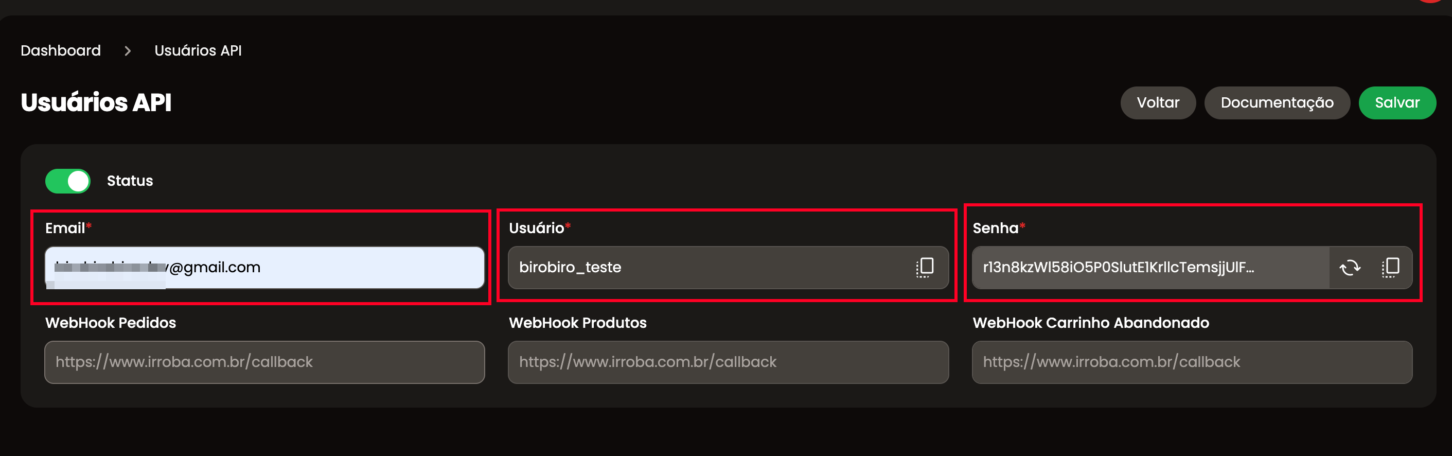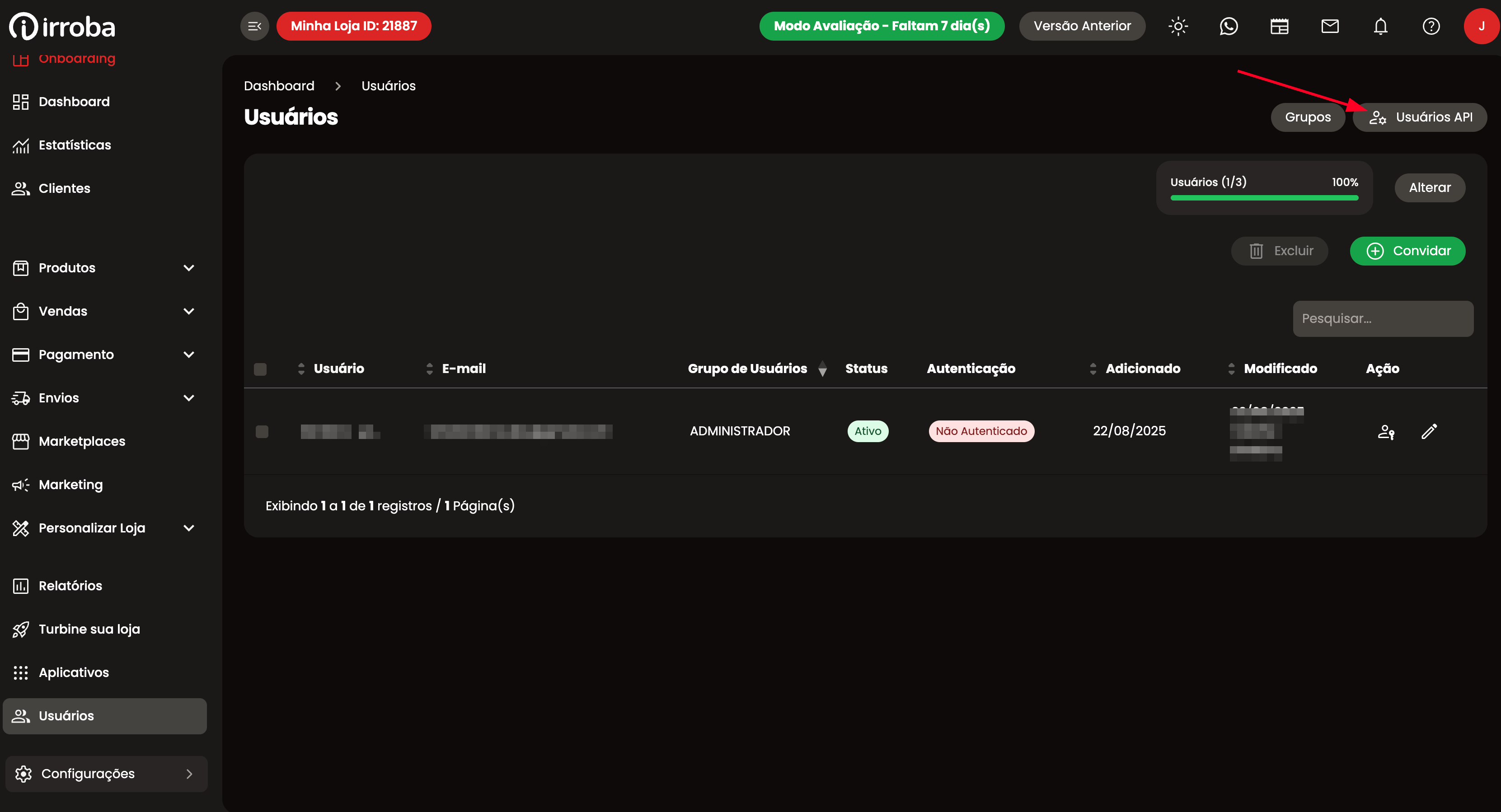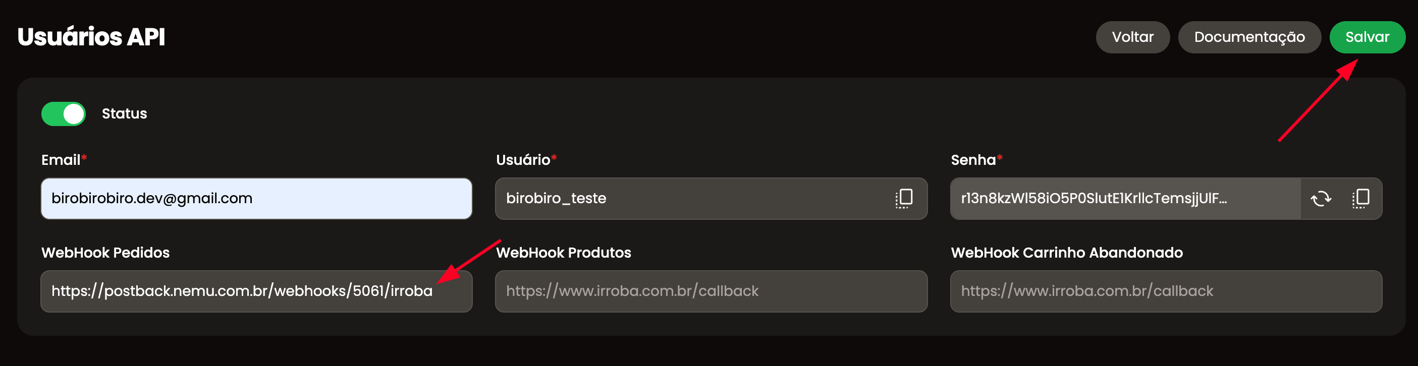 No painel da Irroba, vá até Usuários e Clique em Usuários API