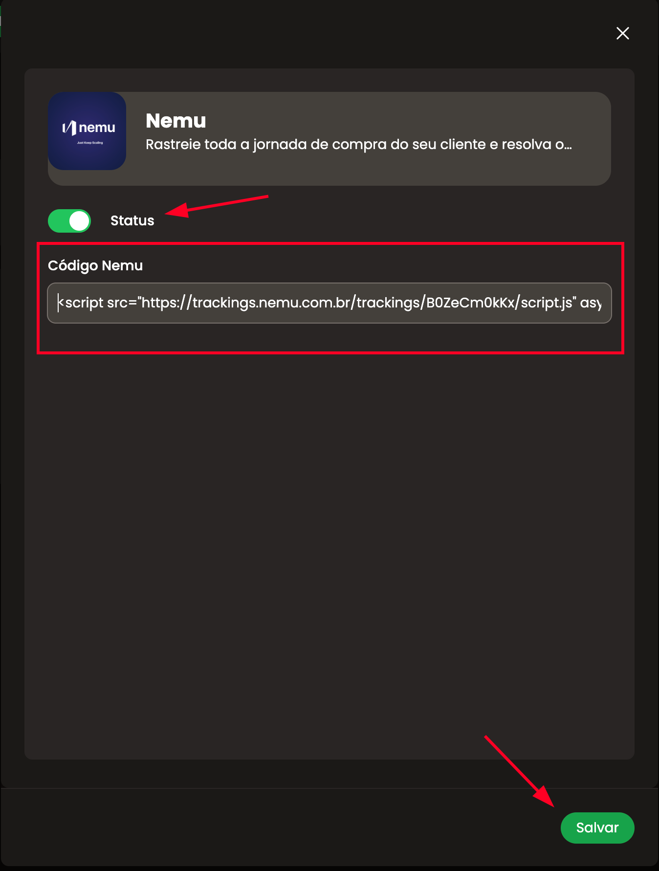 copiado no Configurando o Pixel da Nemu e habilite o status para Ativo e clique em Salvar