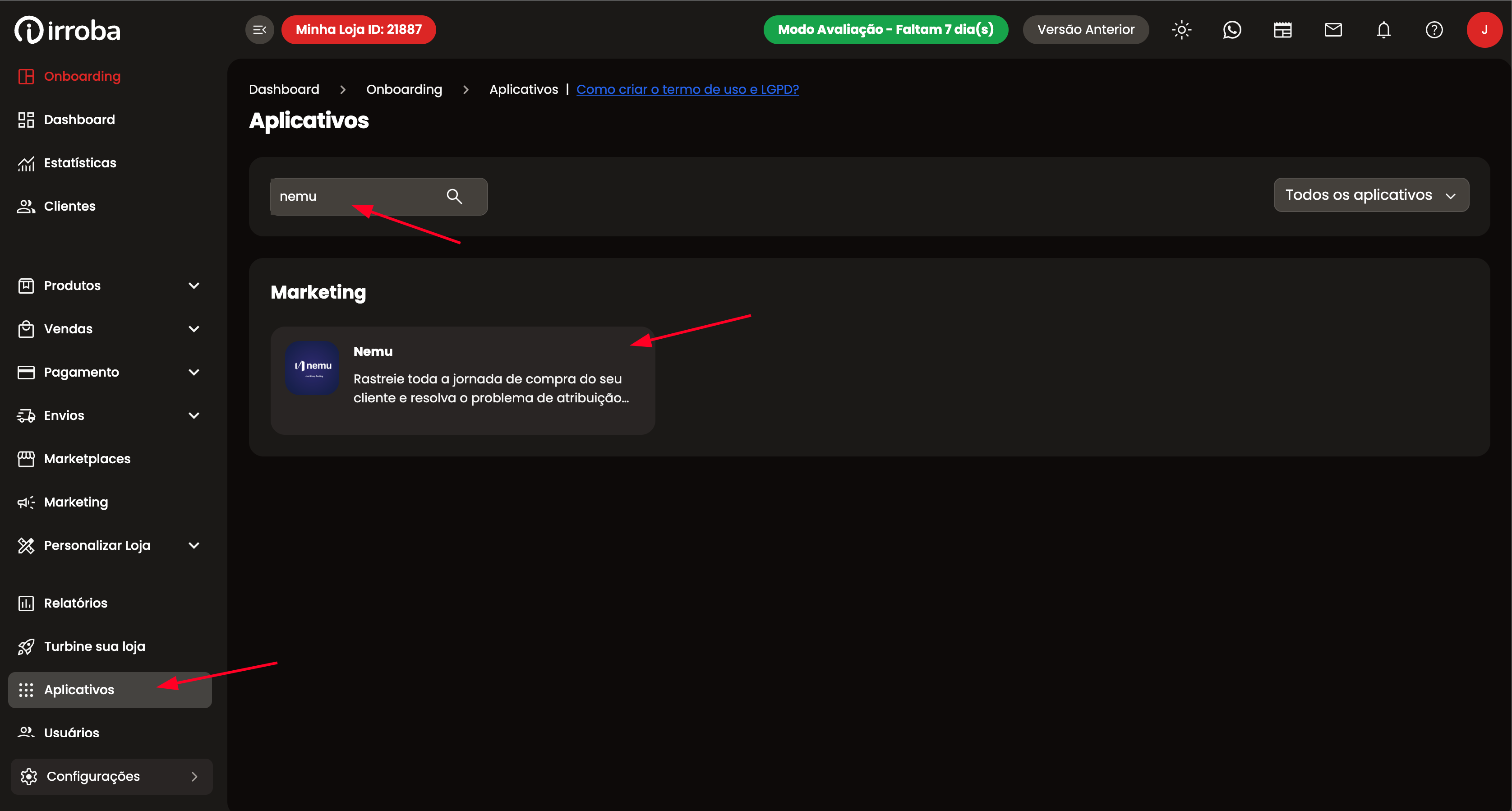 - Na plataforma da Irroba, em Aplicativos pesquise por Nemu