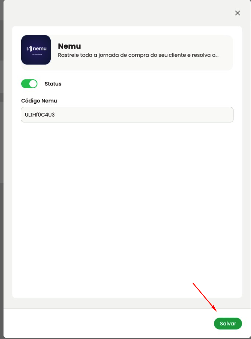 data-tracking-iddo<script>do Configurando o Pixel da Nemu e habilite o status para Ativo e clique em Salvar
