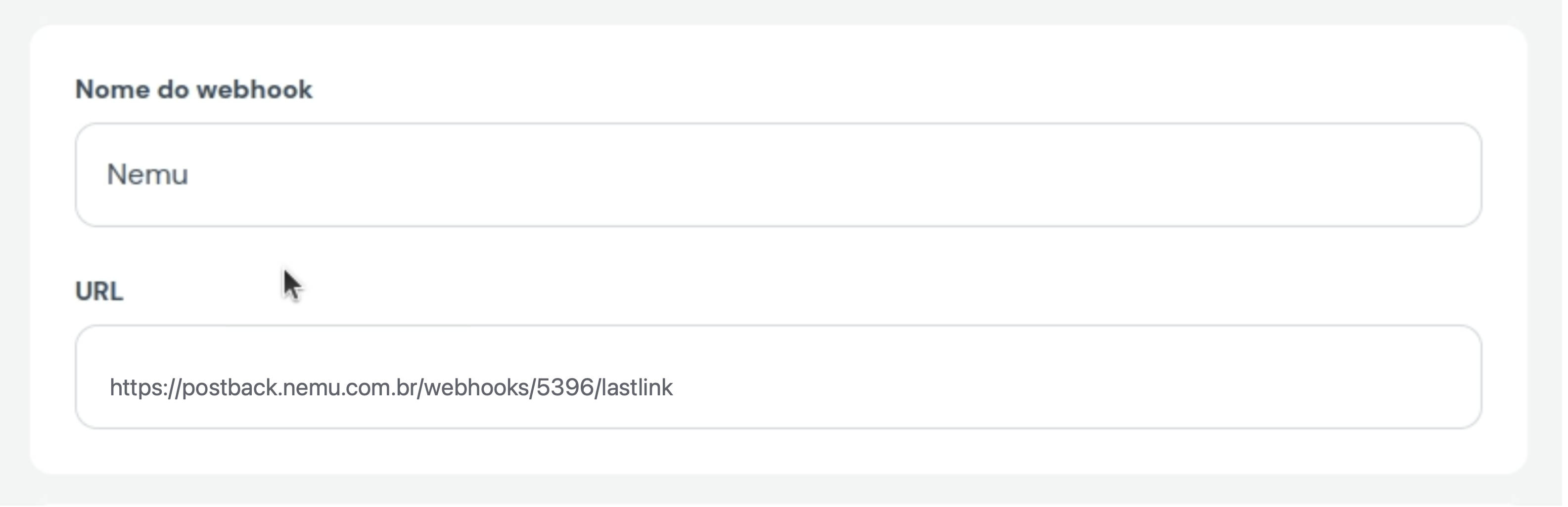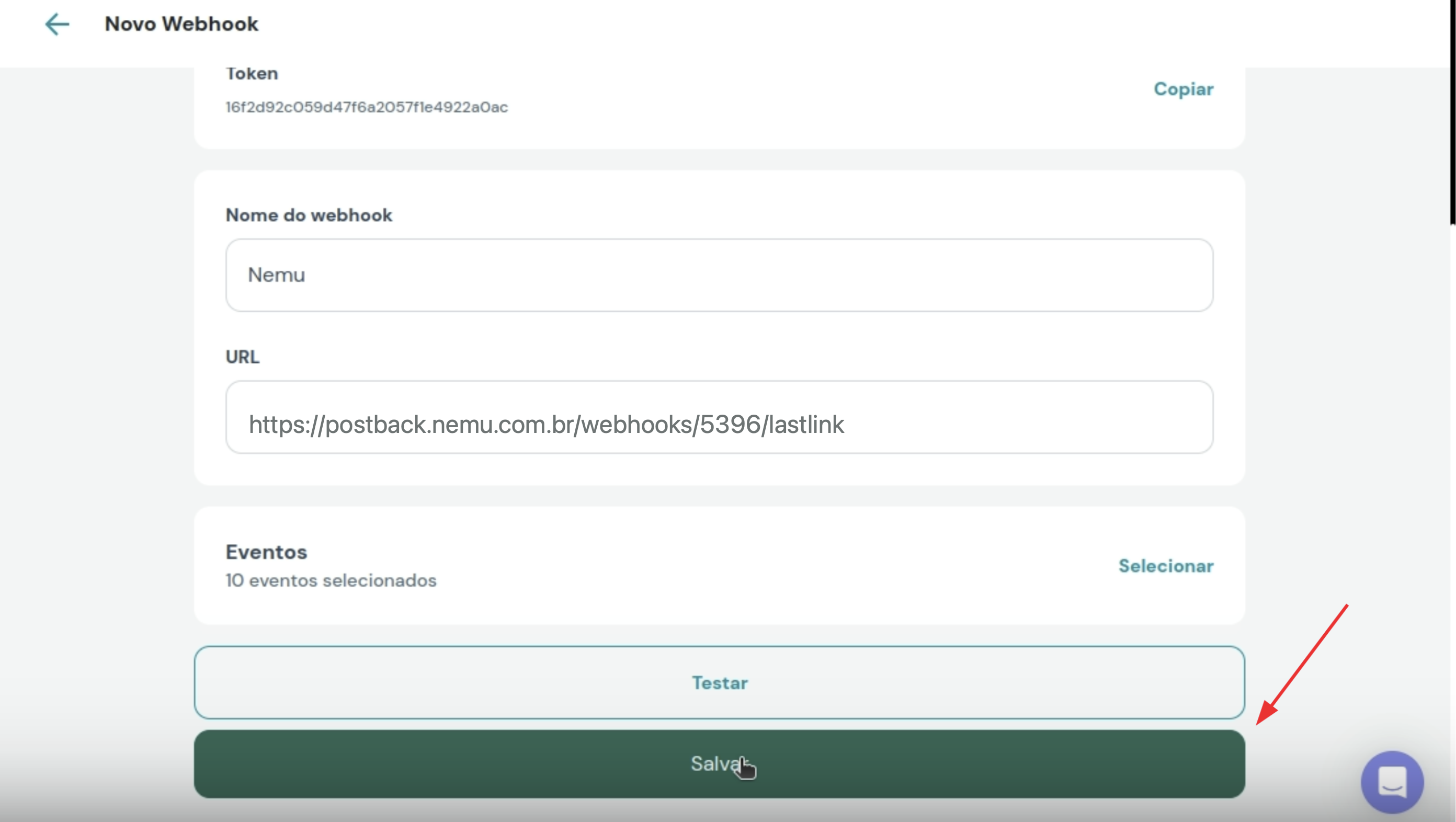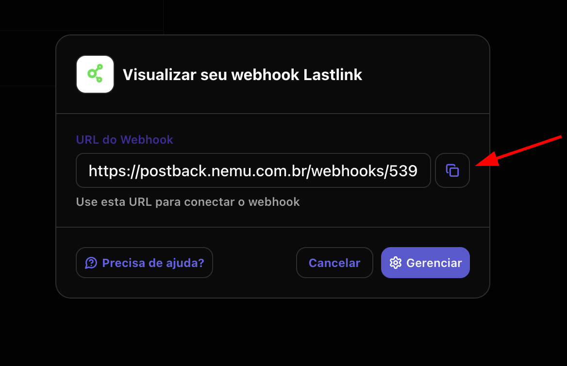 - Clique no botão para copiar a URL do webhook gerada pela Nemu.