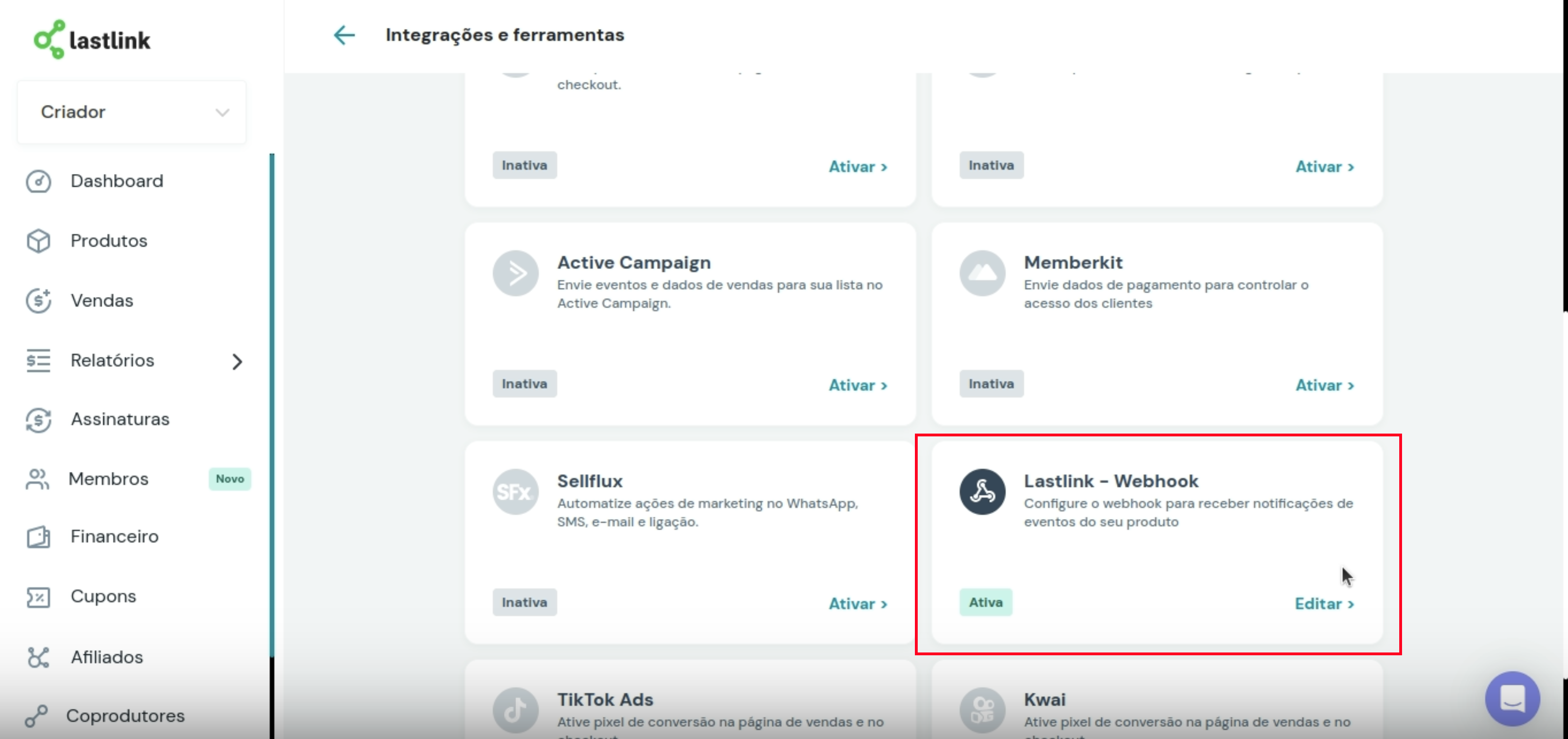 - Pesquise por LastLink - Webhook e clique em Ativar/Editar.