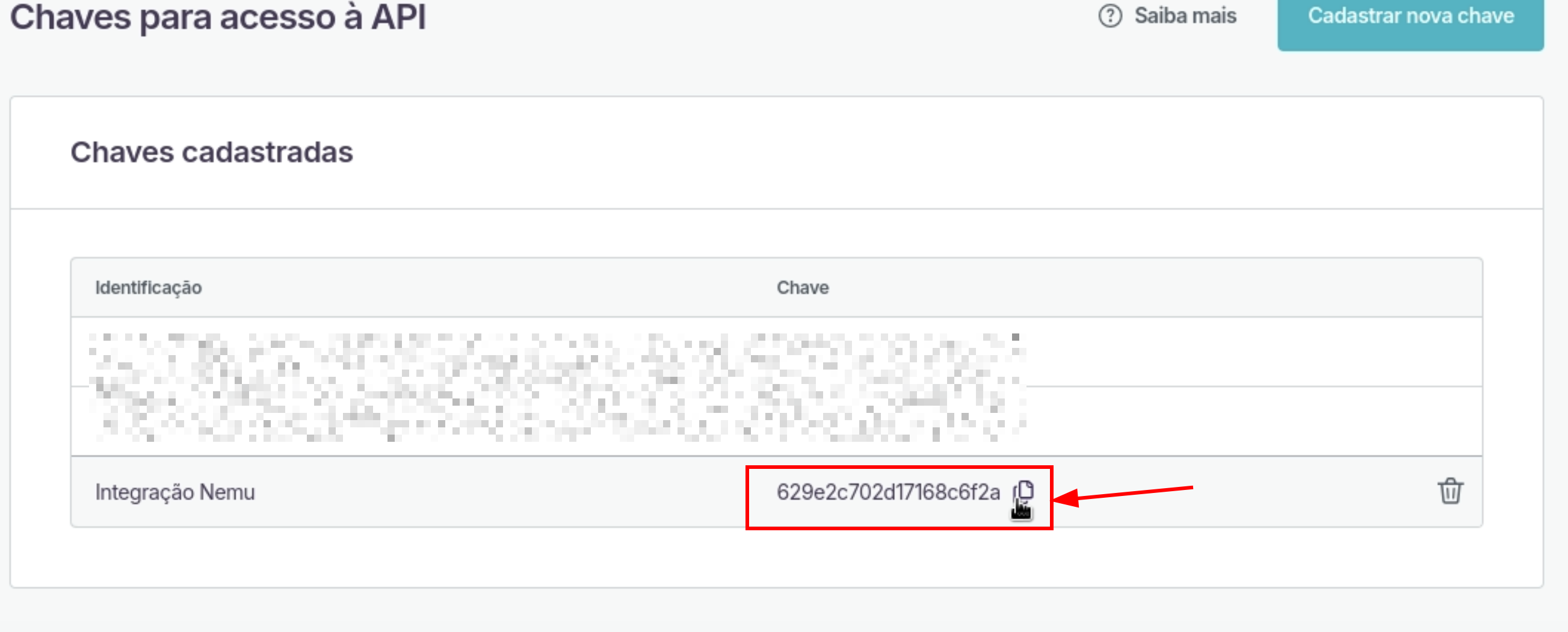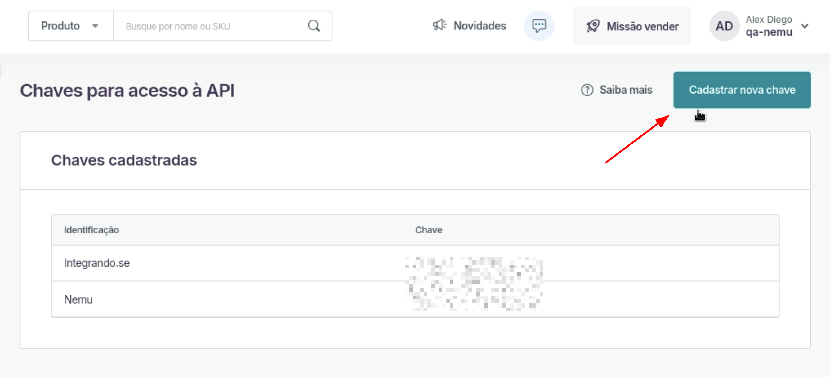- Clique no botão Cadastrar nova chave