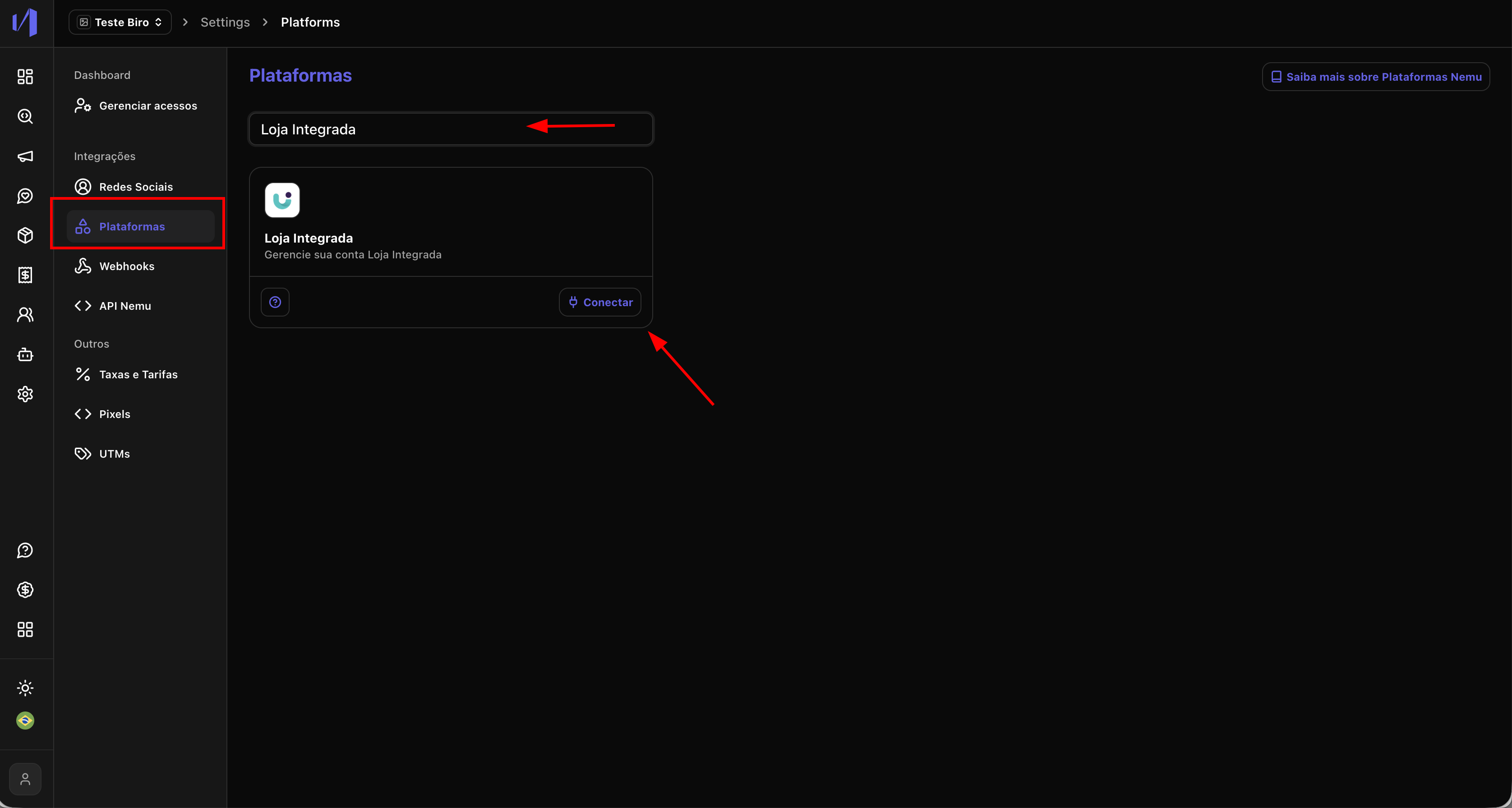 - No painel da Nemu, vá até Configurações > Plataformas.