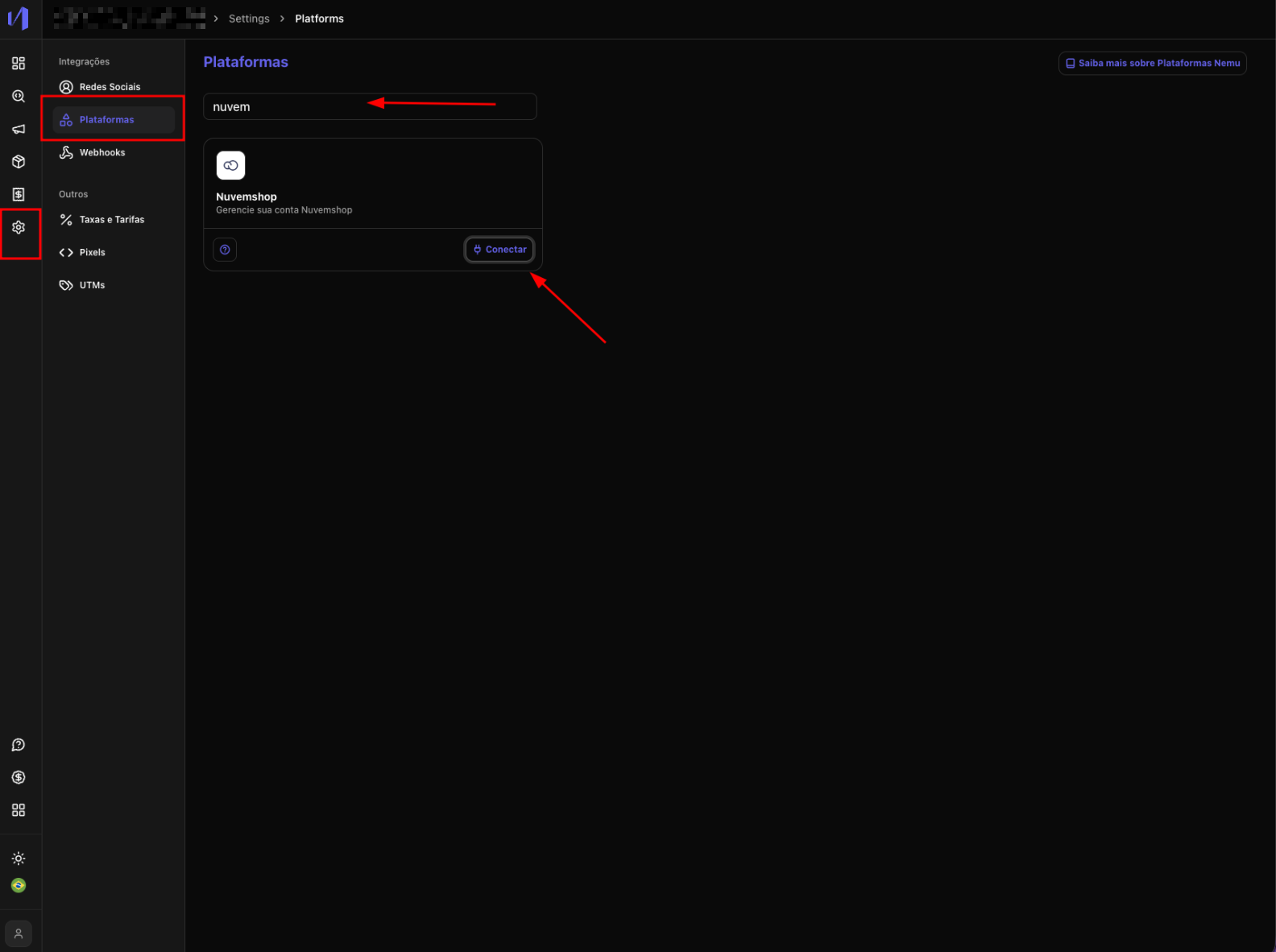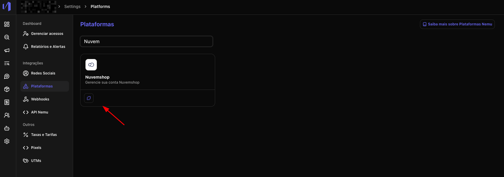 - No painel da Nemu, acesse Configurações > Plataformas.
