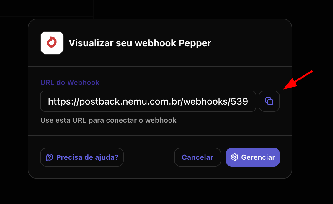- Clique no botão para copiar a URL do webhook gerada pela Nemu.