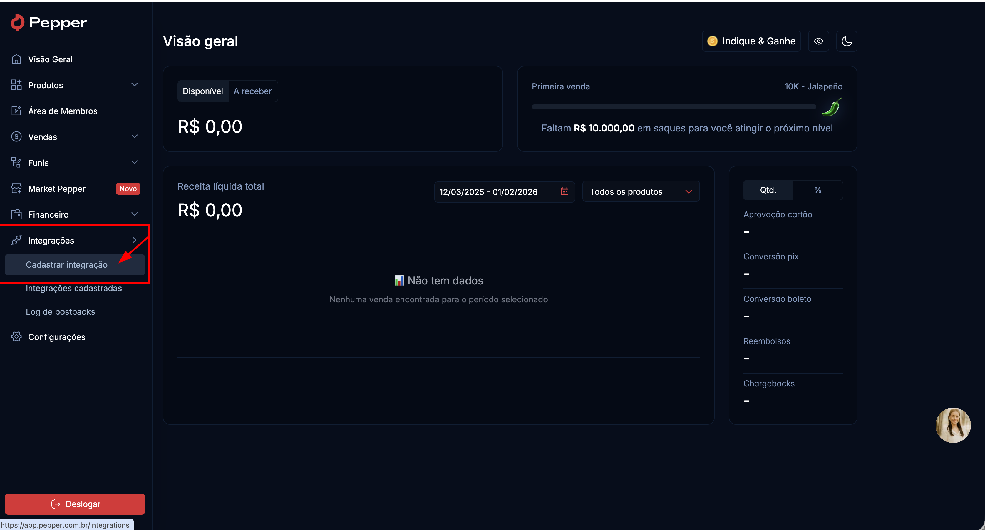- No painel da Pepper, vá até Integrações > Cadastrar Integração.