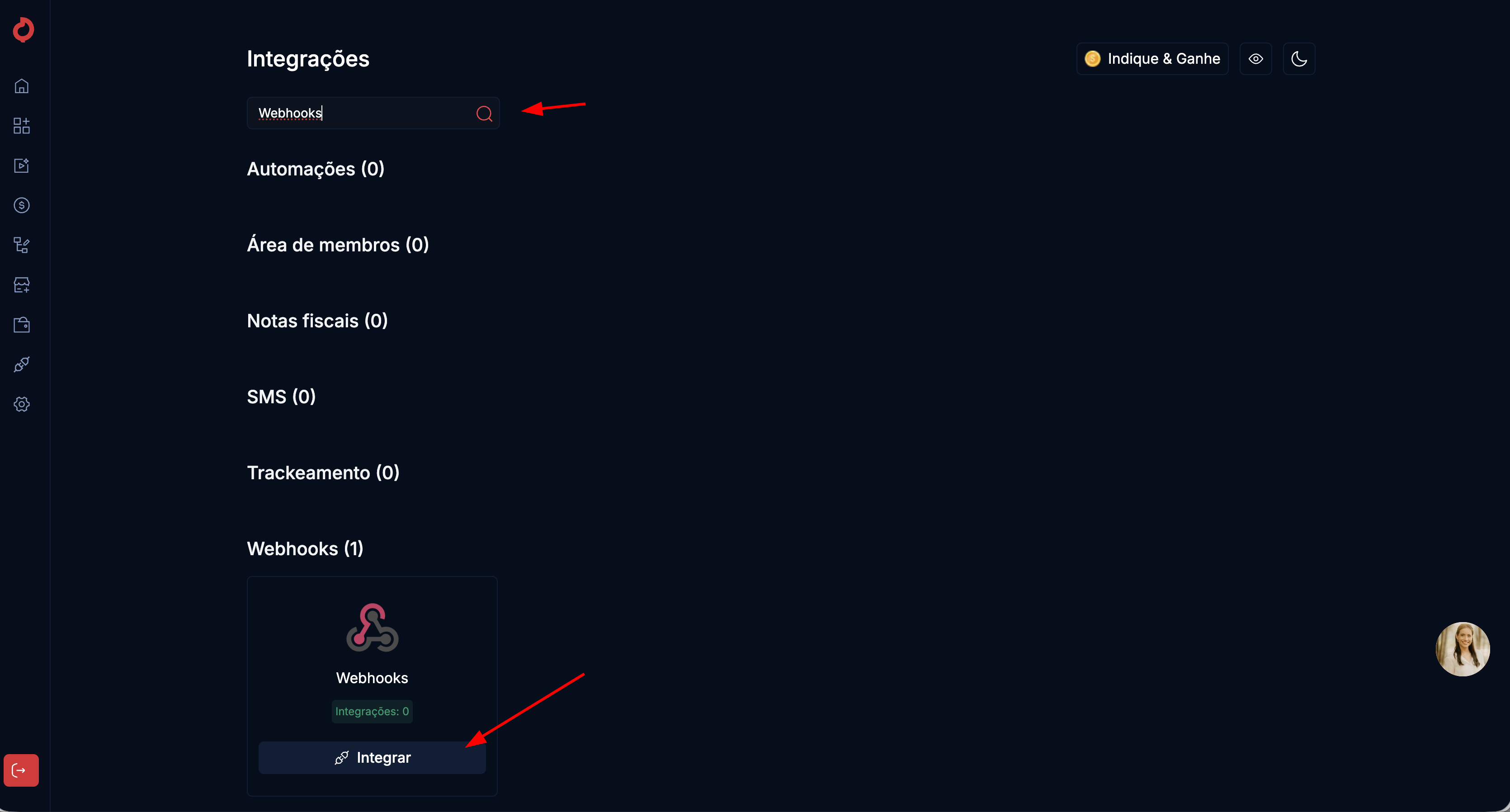 - Pesquise por Webhooks e clique em Integrar.