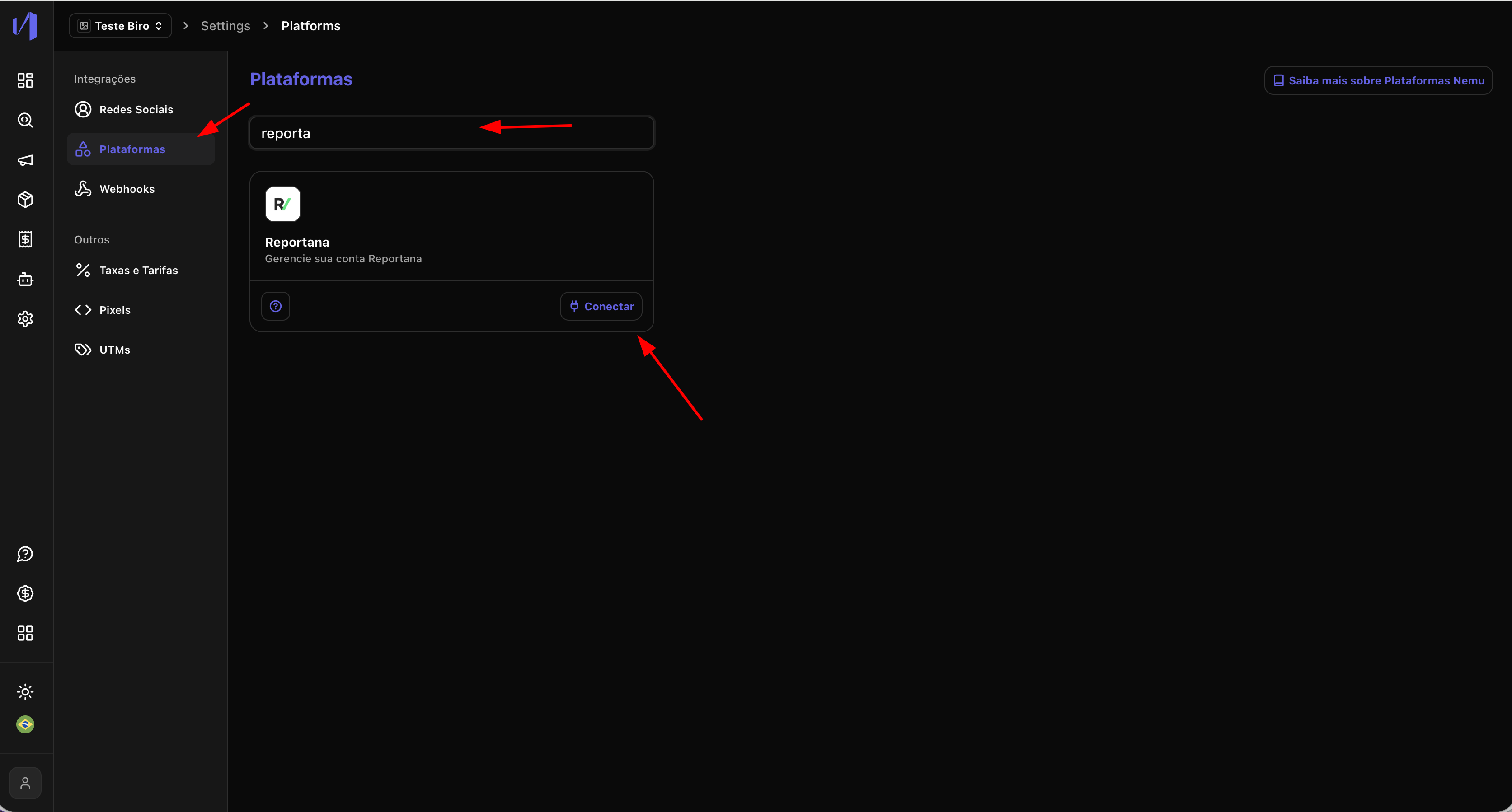 - Na dashboard da Nemu, vá até Configurações > Plataformas