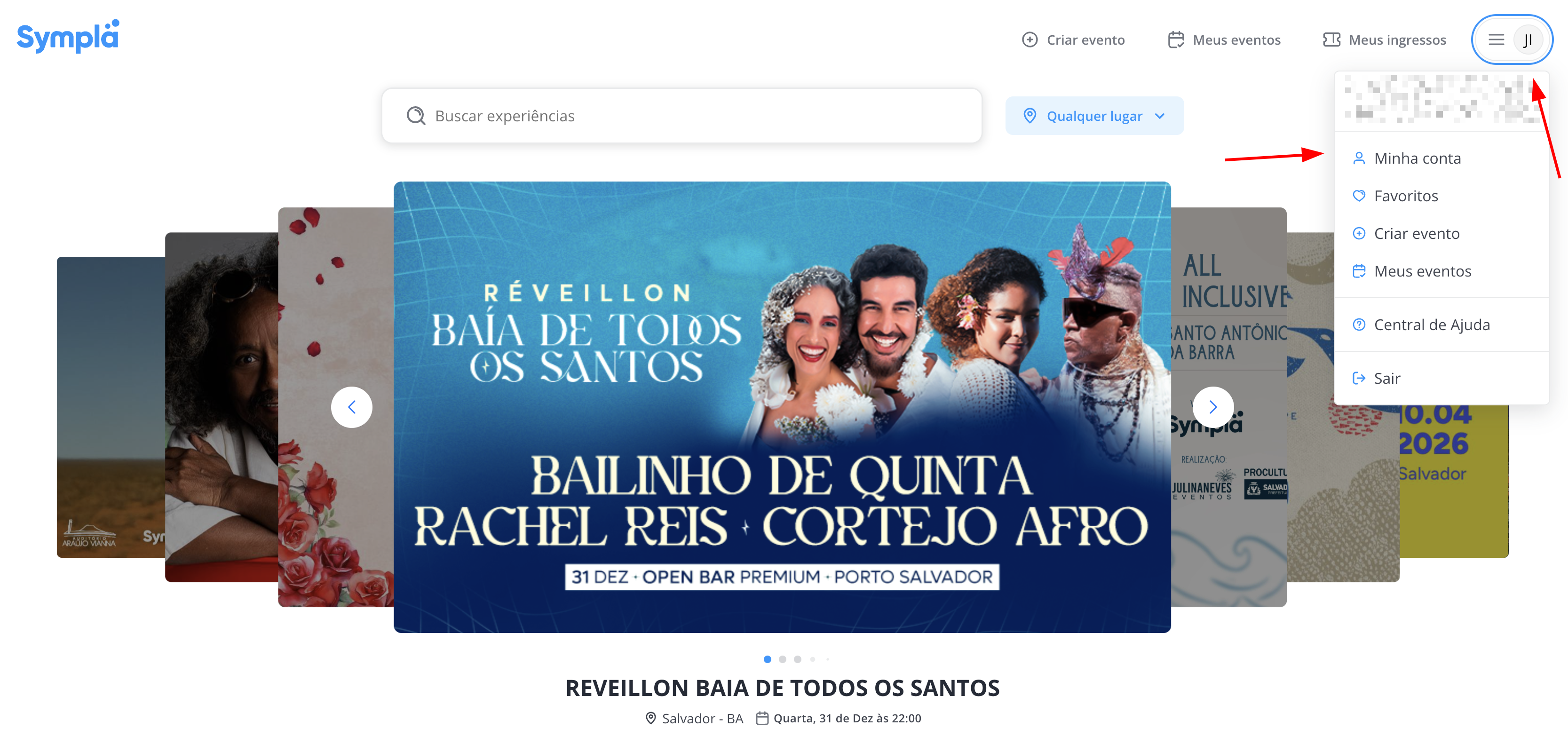 - No painel da Sympla, no menu superior direito no avatar do usuário e clique em Minha Conta