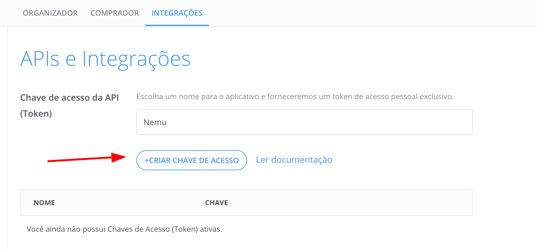 - Na seção Integrações defina um nome para a integração e clique em + CRIAR CHAVE DE ACESSO