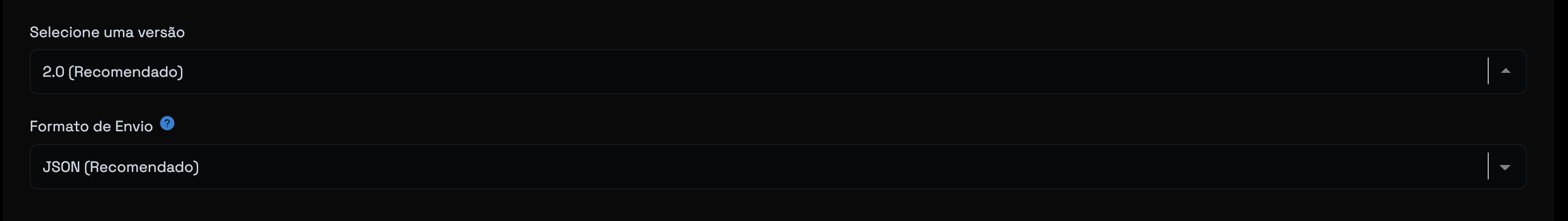 - Selecione a versão do webhook como Versão 2 (Recomendado) e o Formato de envio como JSON (Recomendado)