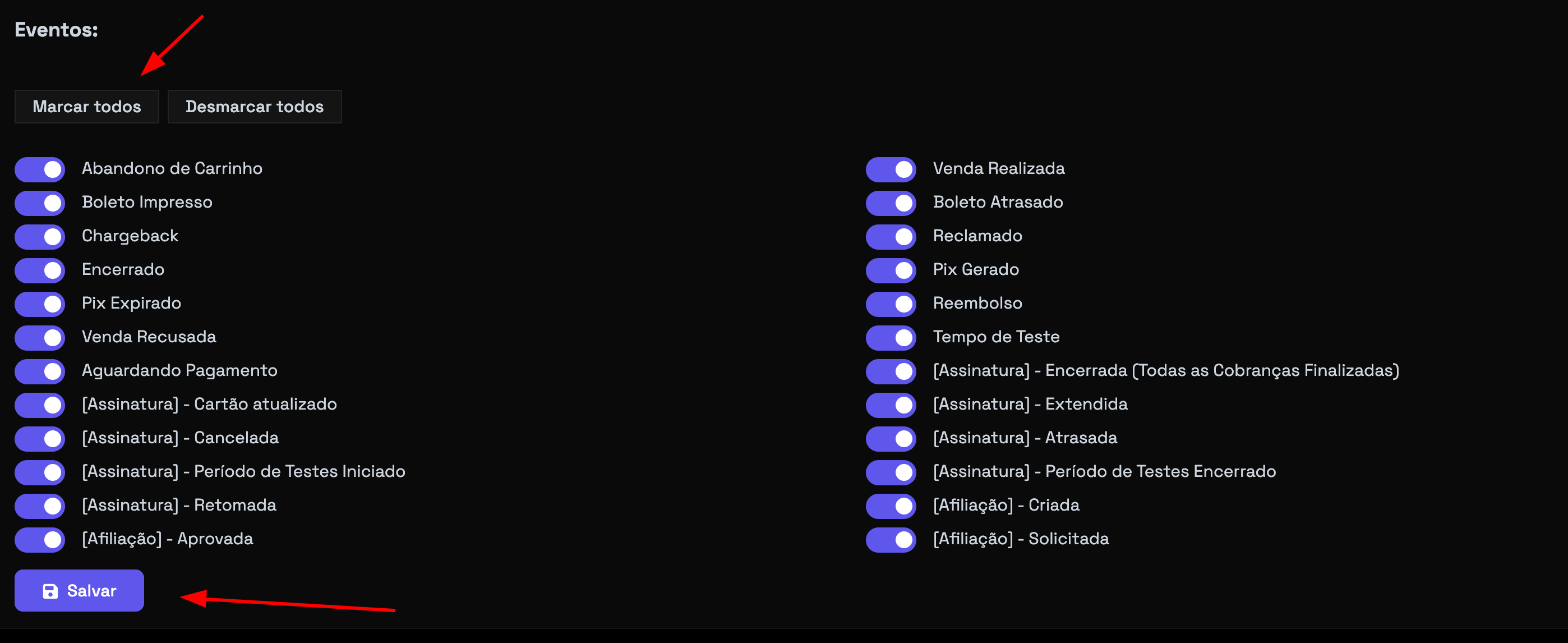 - Em eventos clique em Marcar todos e clique em Salvar