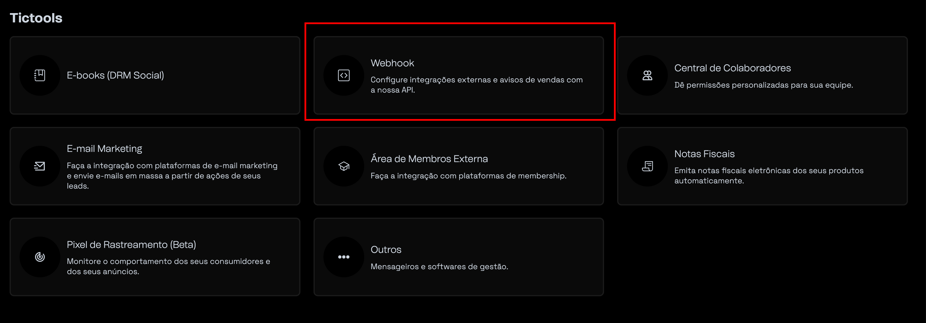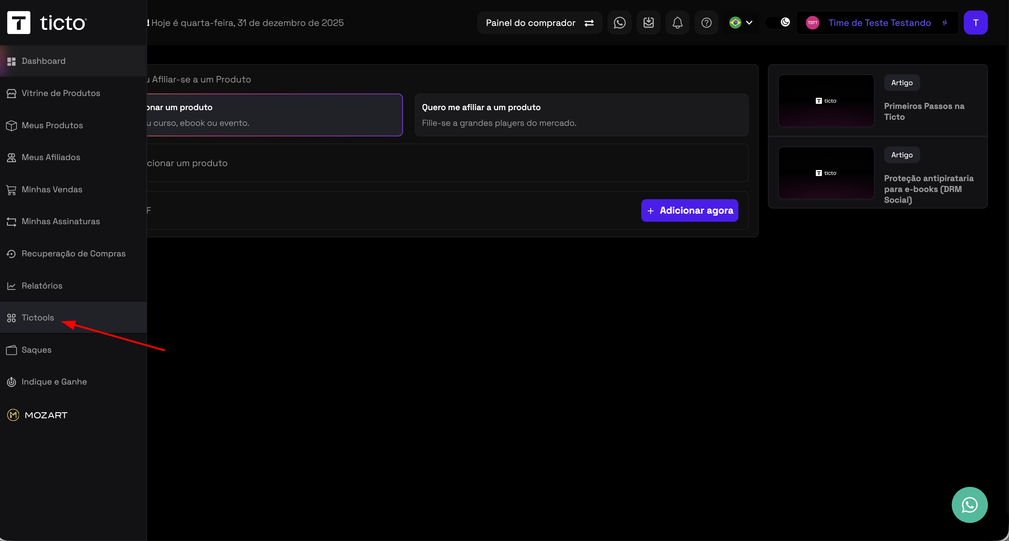 - Acesse o painel da Ticto, na navegação lateral clique em Tictools