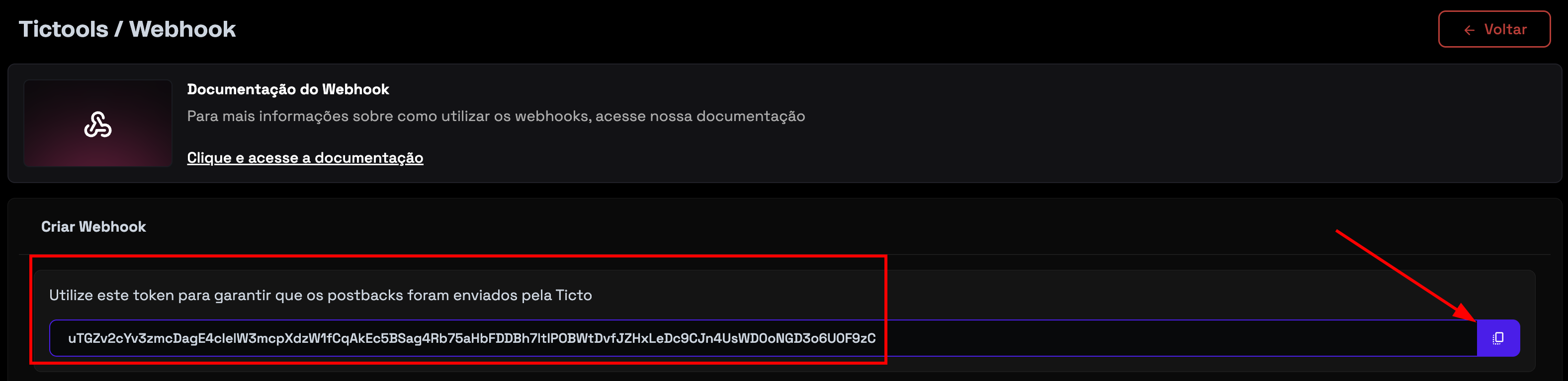 - Copie o token gerado pela Ticto.