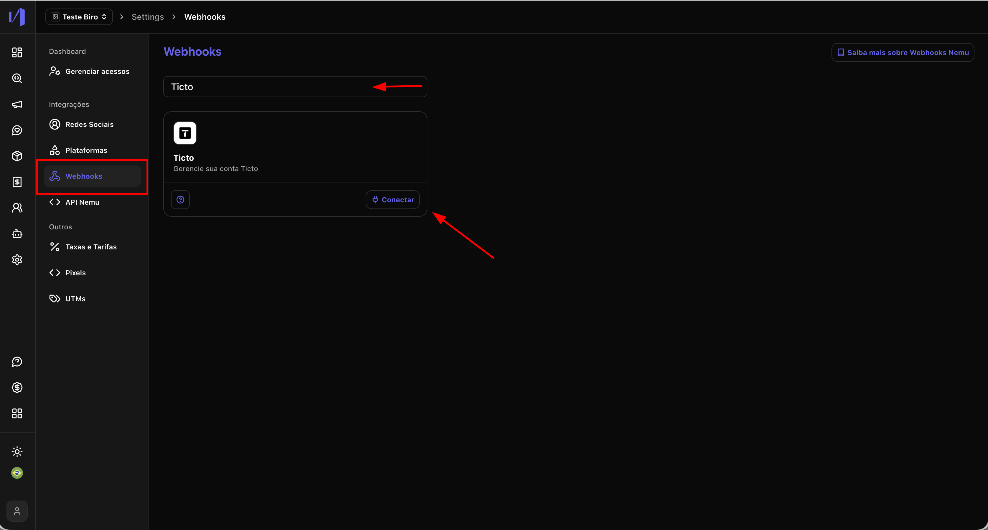 - No painel da Nemu, vá até Configurações > Webhooks.