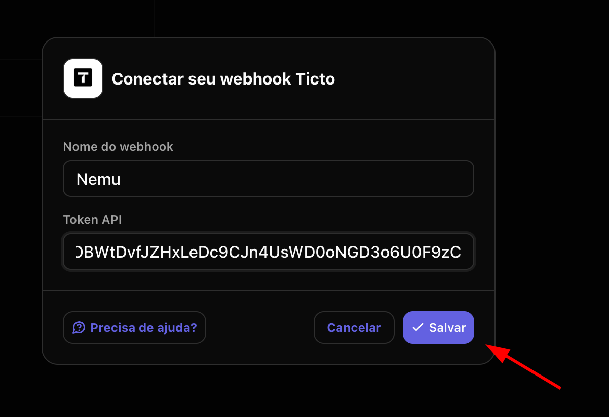 - Defina um nome para o webhook, cole o token gerado pela Ticto no campo Token e clique em Salvar.