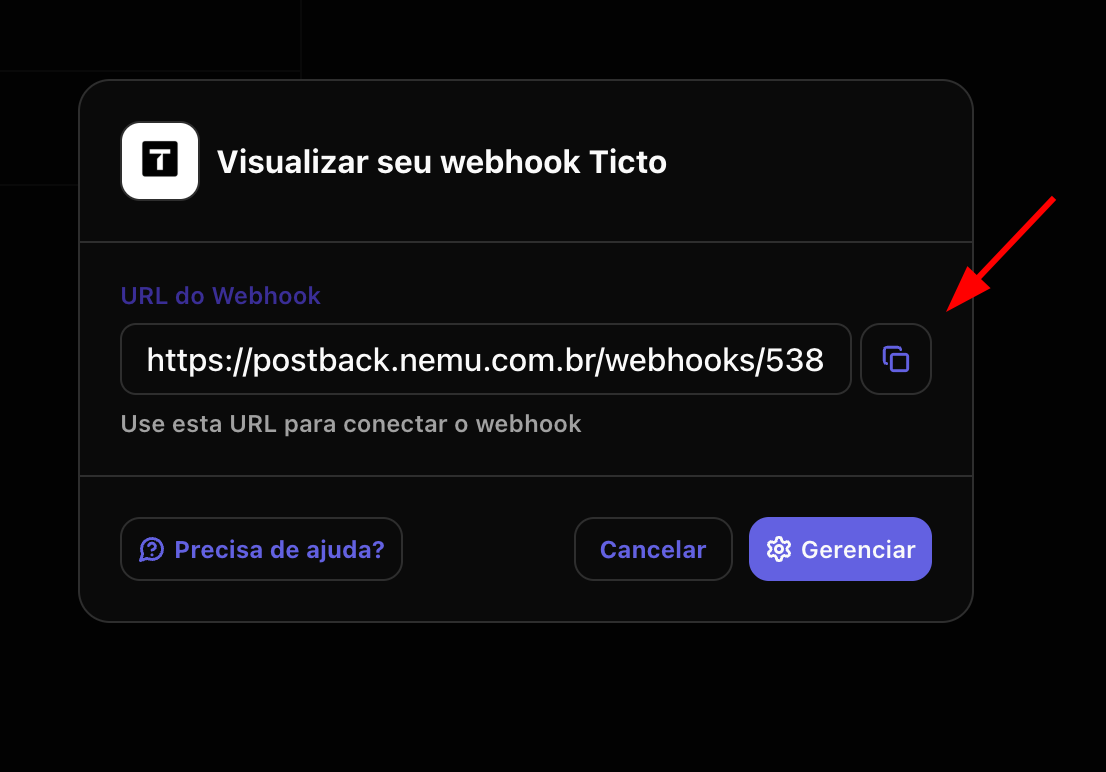 - Clique no botão para copiar a URL do webhook gerada pela Nemu.