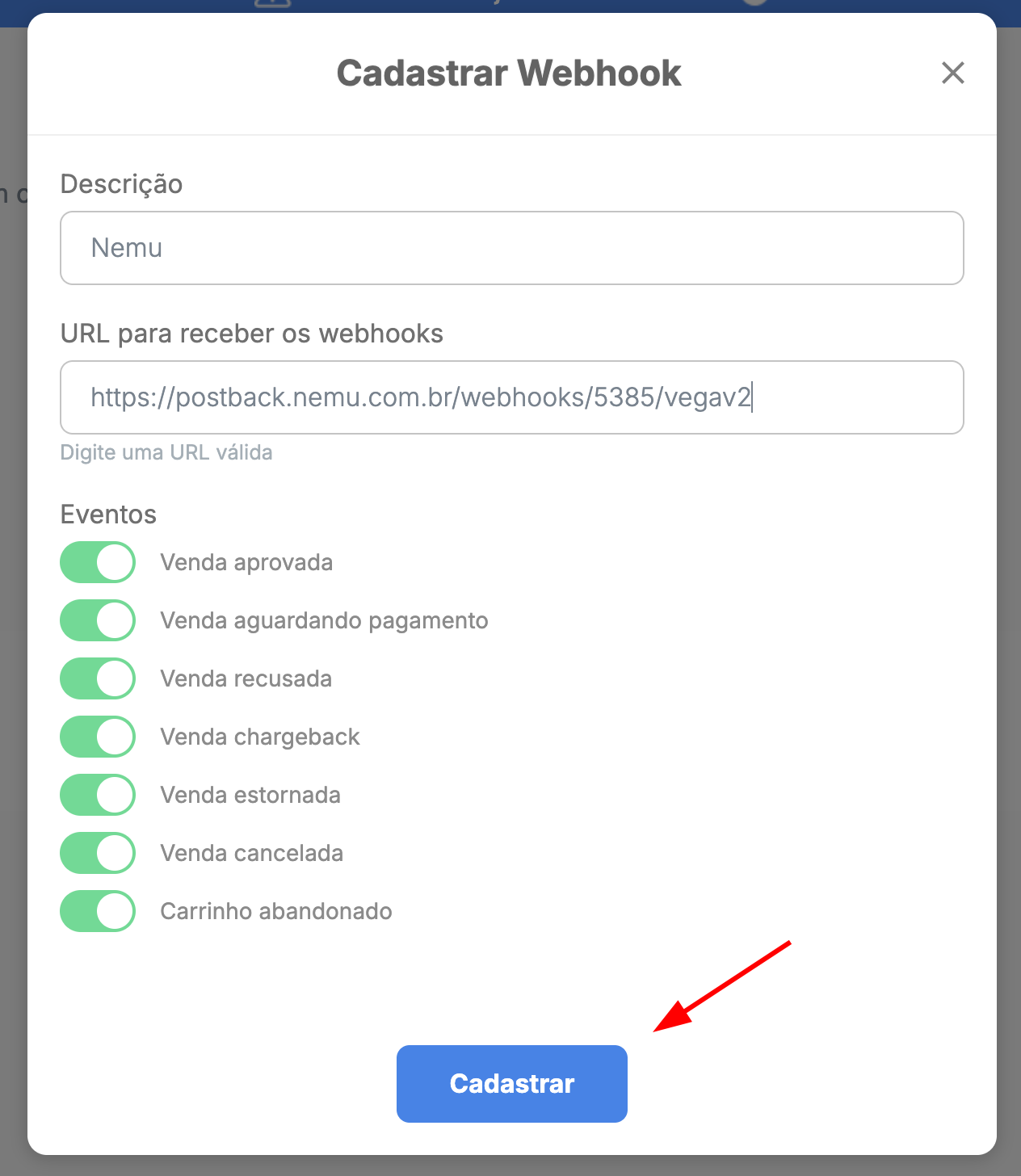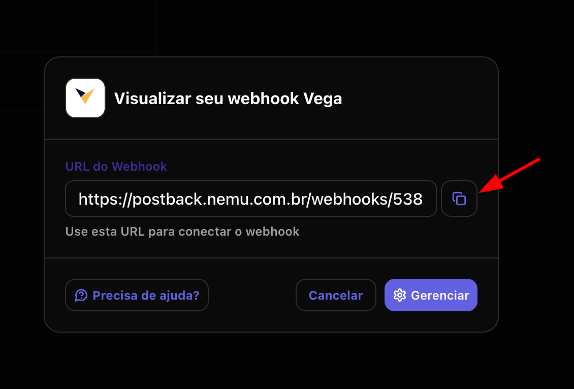 - Clique no botão para copiar a URL do webhook gerada pela Nemu.