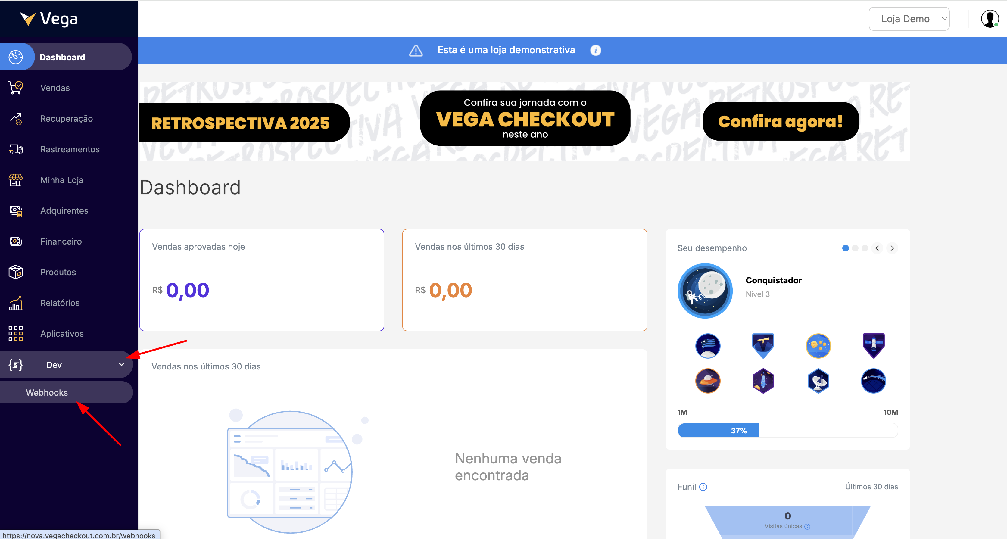 - No painel da Vega, na navegação lateral, vá até Dev > Webhooks.
