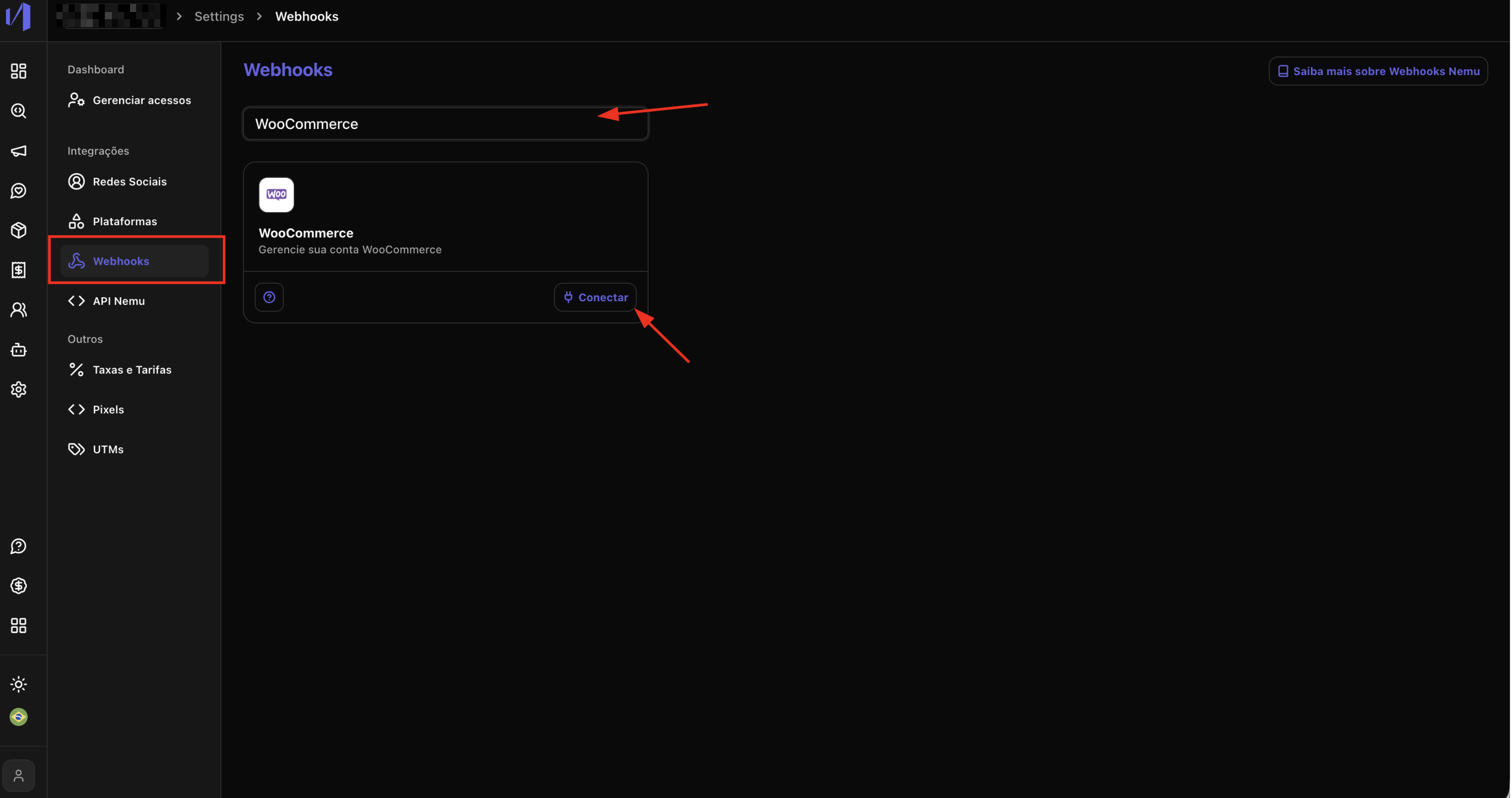 - No painel da Nemu, vá até Configurações > Webhooks.