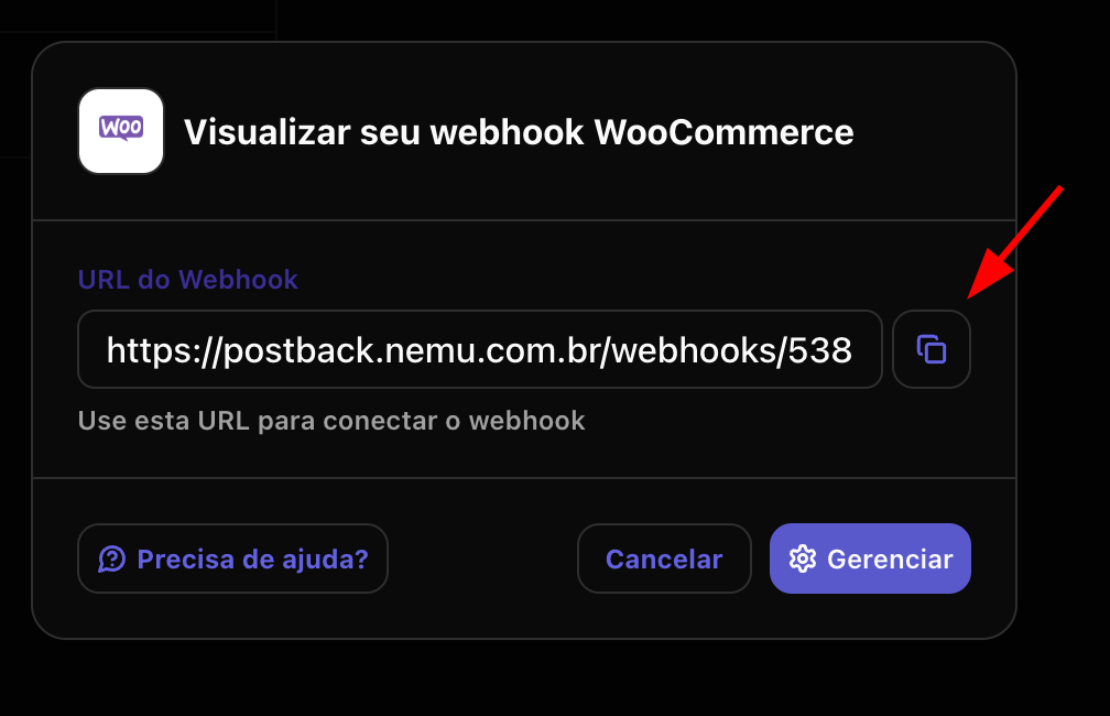 - Clique no botão para copiar a URL do webhook gerada pela Nemu.