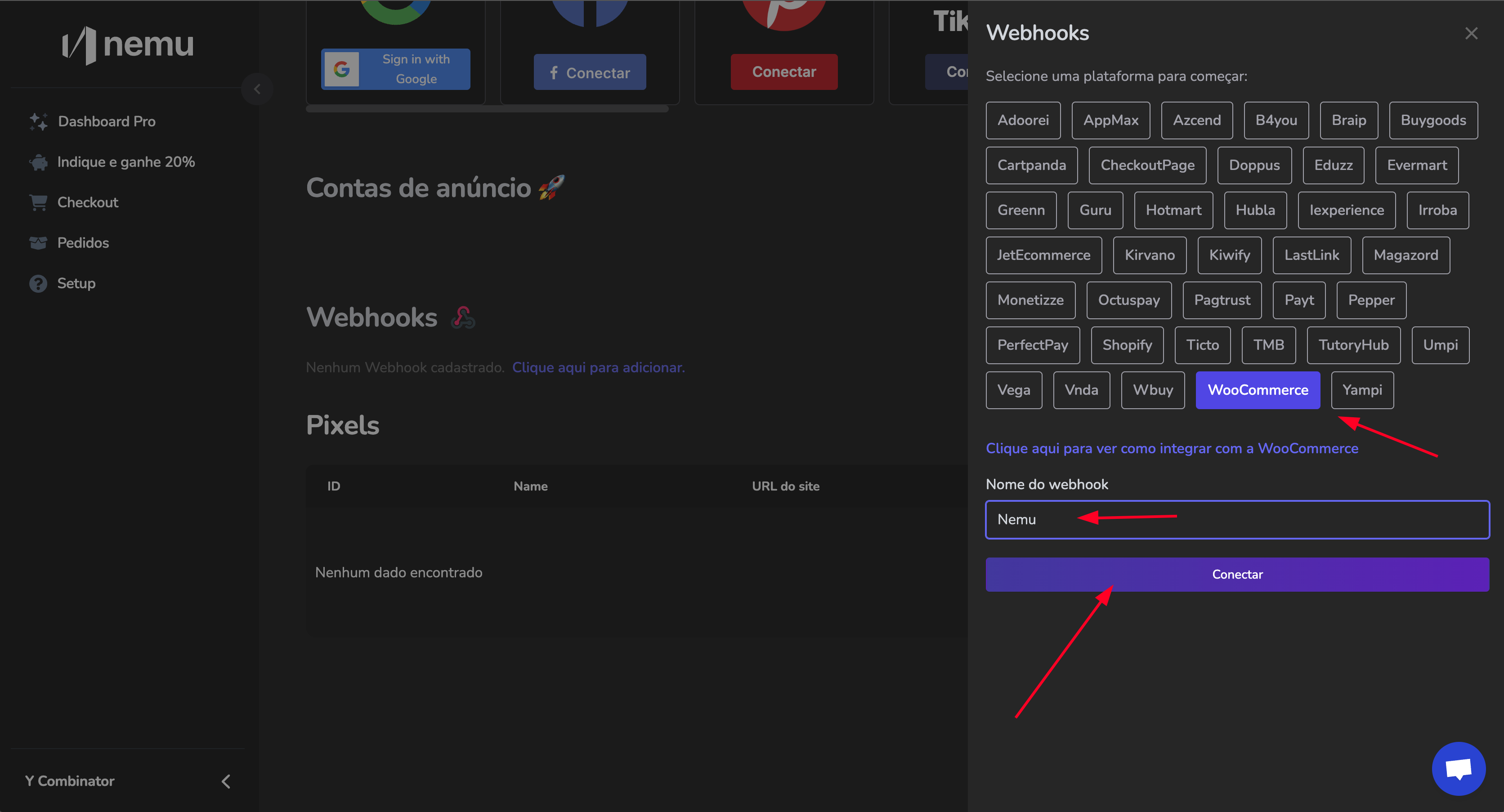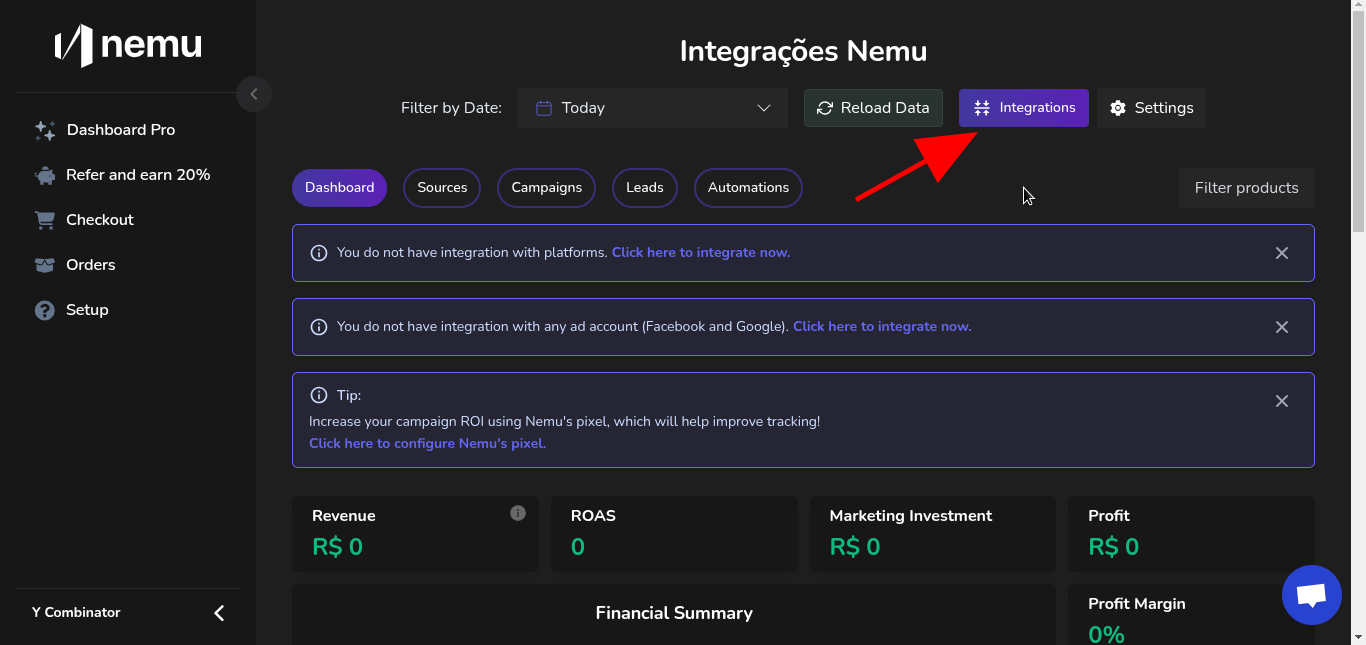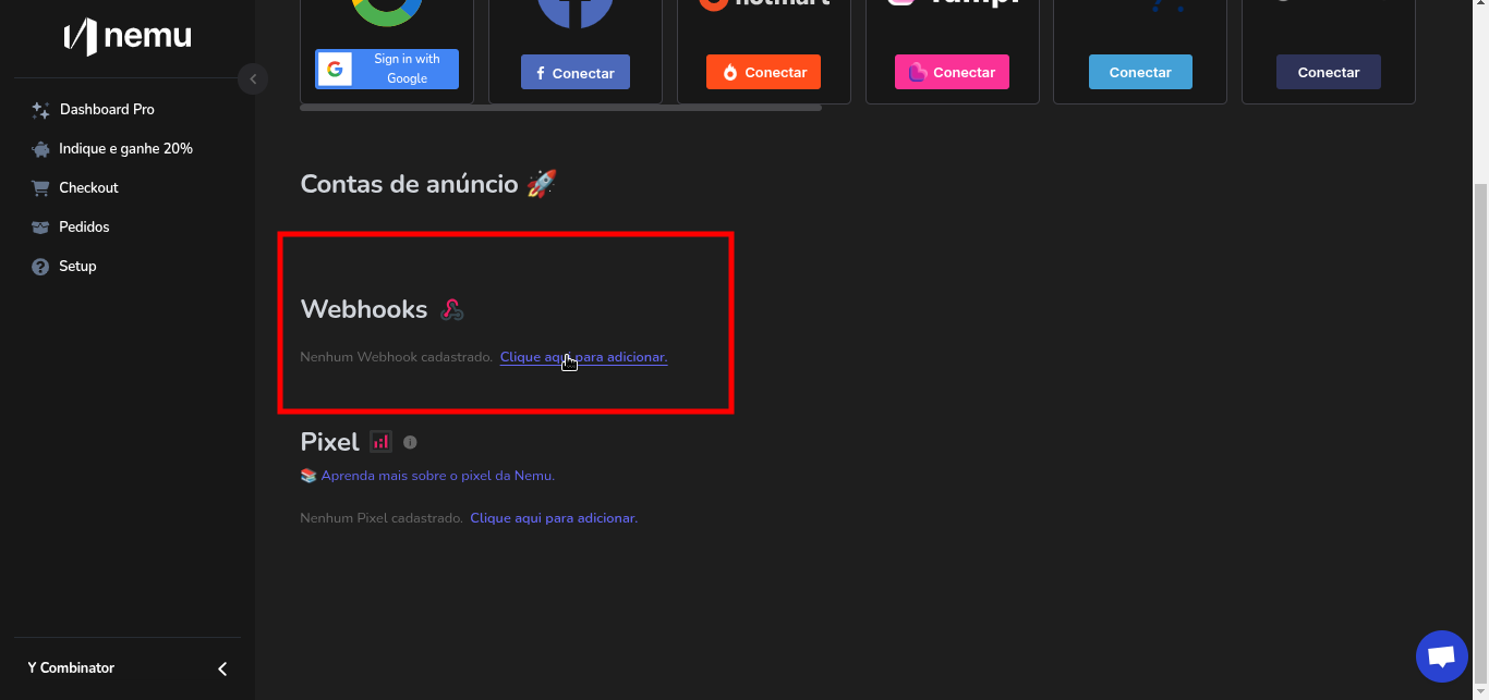 1. Acesse a aba de Integrações no painel da Nemu