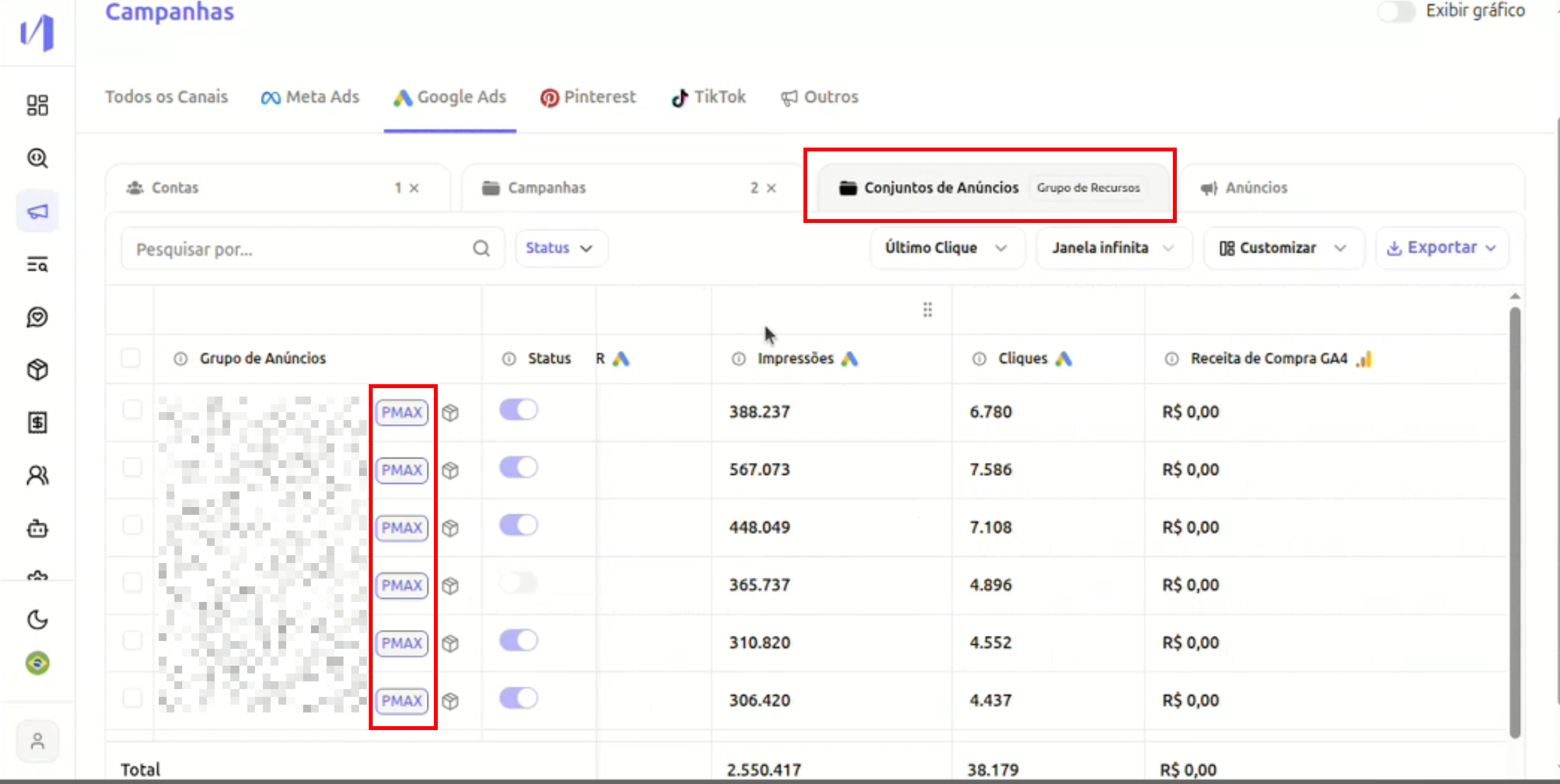 Se houver ao menos uma campanha PMAX selecionada:- A interface indicará que existem Grupos de Recursos