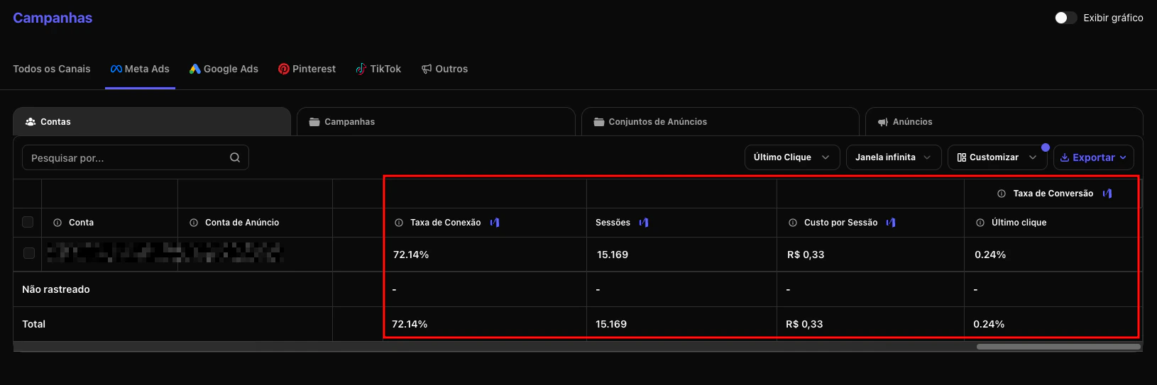 Dentro da aba de campanhas, os dados de Web Analytics aparecem conectados aos investimentos e resultados de mídia, permitindo análises como:- Sessões