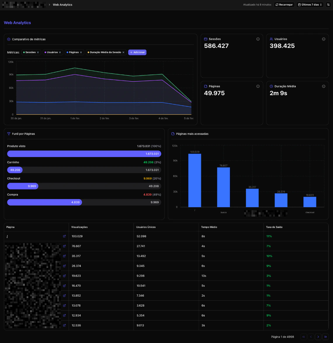 Aqui você encontra a visão completa de navegação, engajamento, páginas e funis.