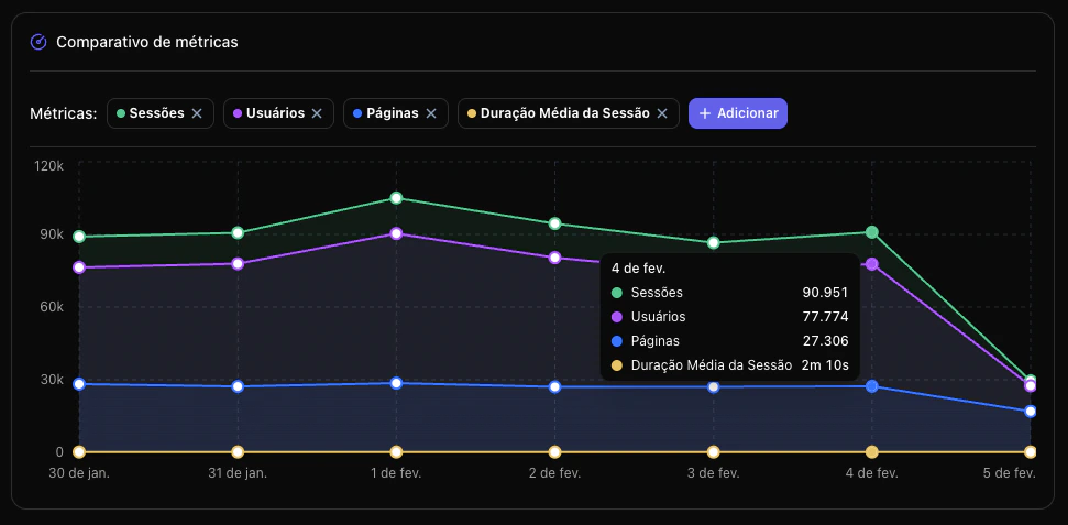 No gráfico de Comparativo de Métricas, é possível visualizar a evolução diária de métricas como:- Sessões