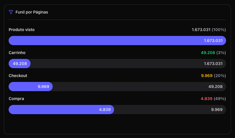 A taxa de conversão indica a porcentagem de usuários que avançam de uma etapa para a seguinte. Exemplos de análises:- Muitos usuários veem produtos, mas poucos vão ao carrinho → possível problema de preço, oferta ou UX
