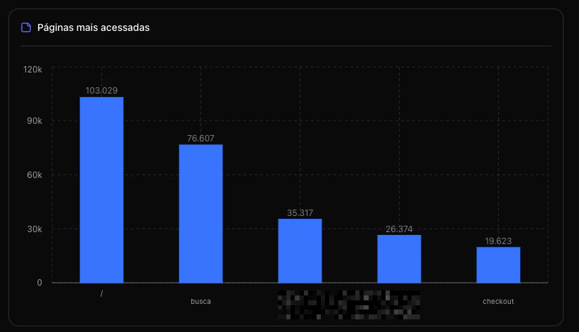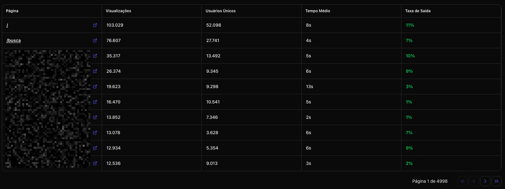 Essa seção mostra as páginas com maior volume de visualizações no período. Para cada página, são exibidas métricas como:- Visualizações